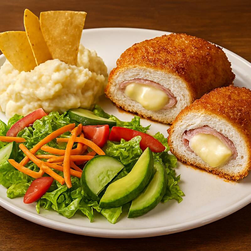 Rellena de jamón y queso manchego. Acompañado de pure y ensalada fresca.