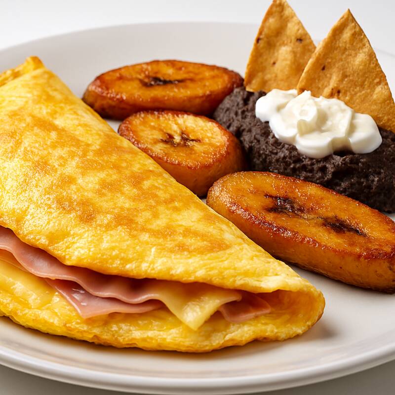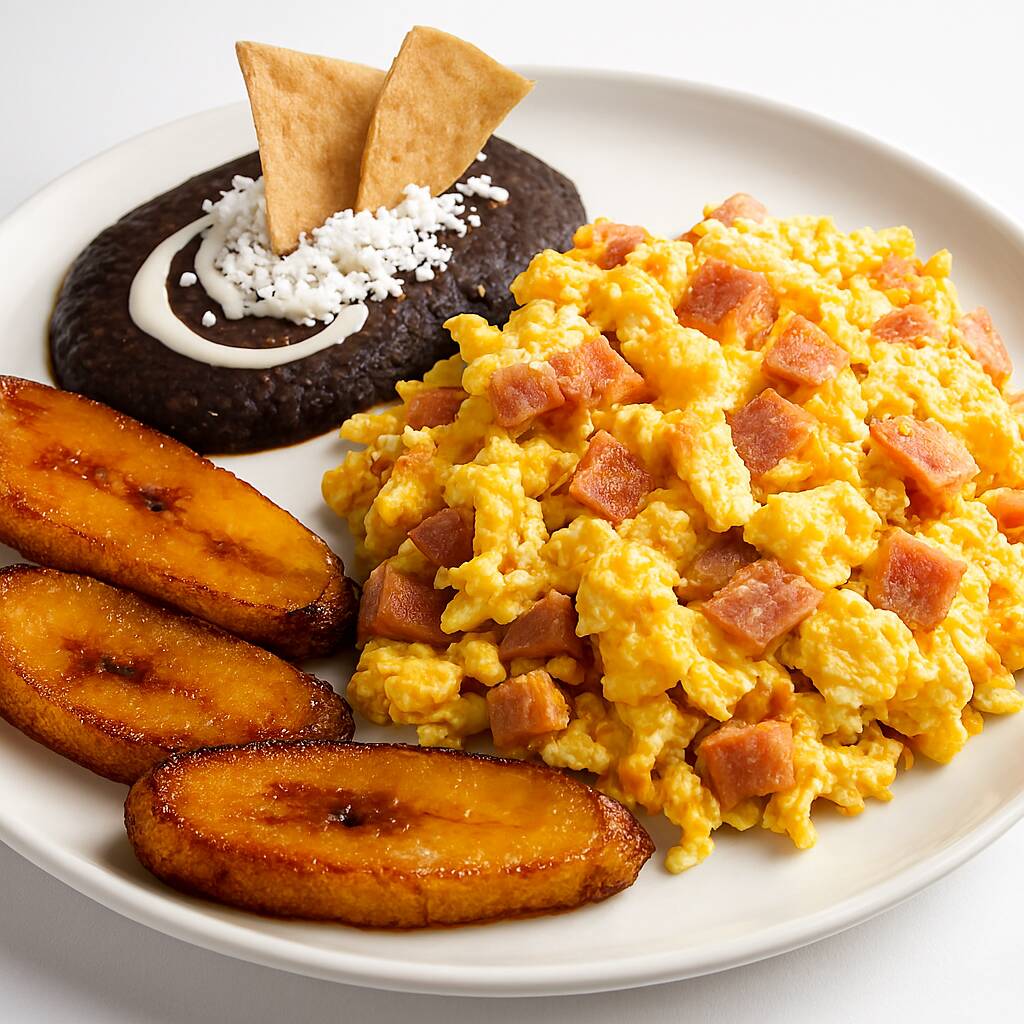 deliciosos huevos al gusto acompañados de frijol y platanos fritos