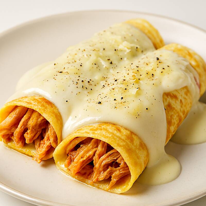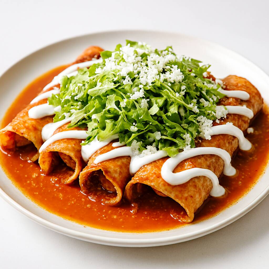 4 piezas de flauta de pollo bañado en salsa roja acompañado de cebolla y aguacate