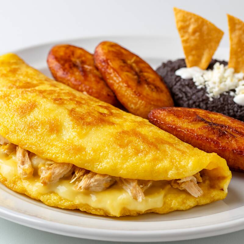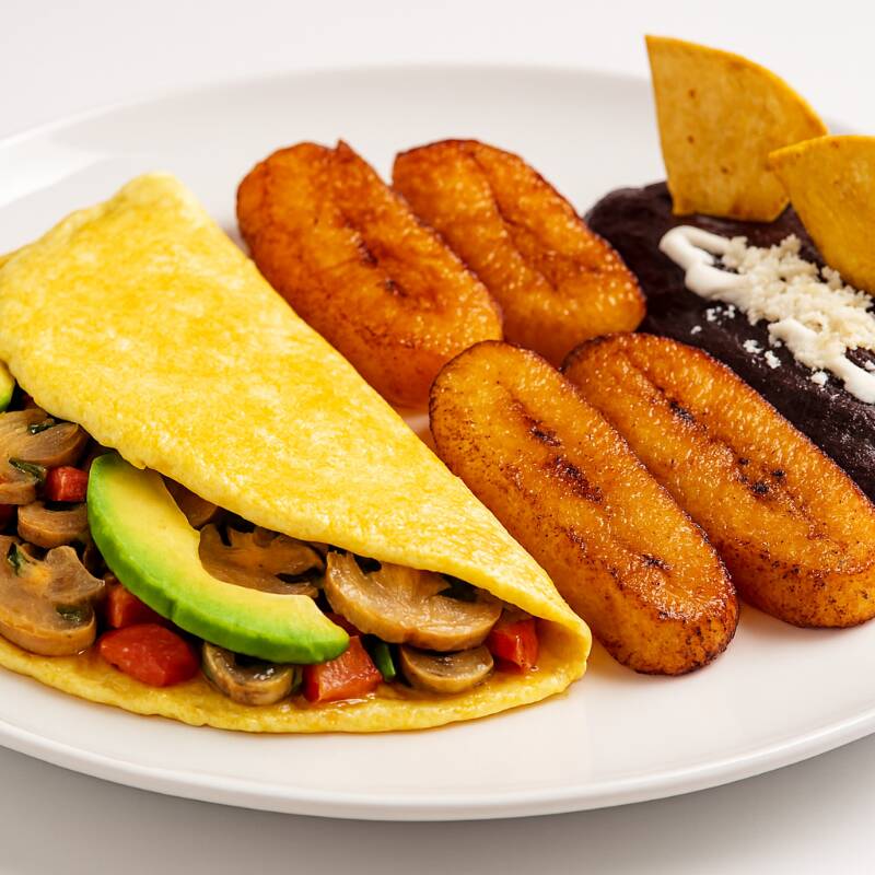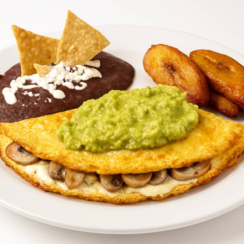 Queso Philadelphia, champiñones y guacamole. Acompañando de frijoles y plátanos fritos.