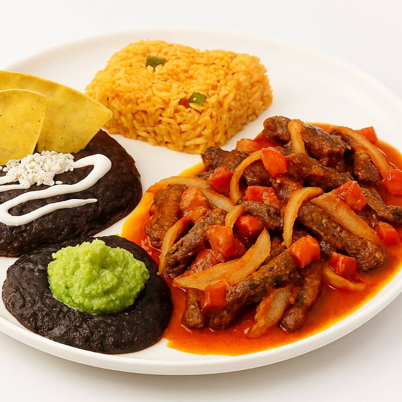 Acompañado de arroz, frijol, cebolla y tomate asados.