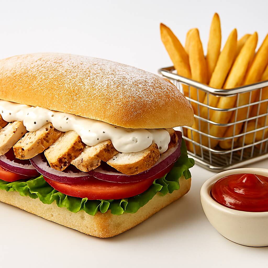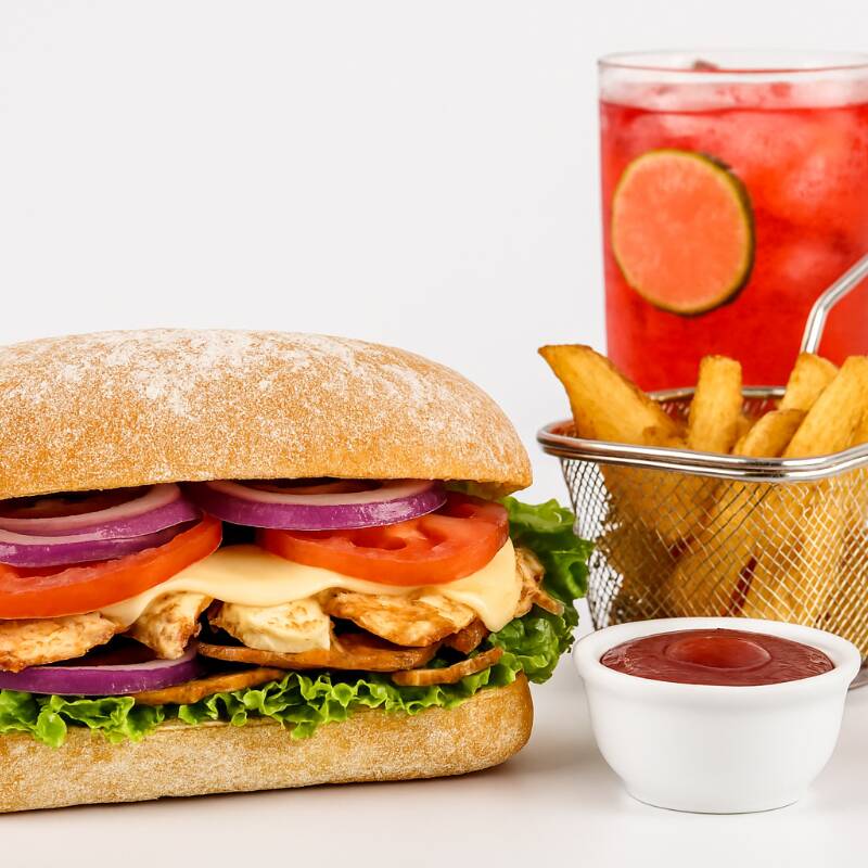 Acompañado de papas a la francesa. Pollo a la plancha, queso crema, aguacate, lechuga, tomate, cebolla. Barra de pan ancha, aplanada y rectangular, con poca miga y corteza muy crujiente.