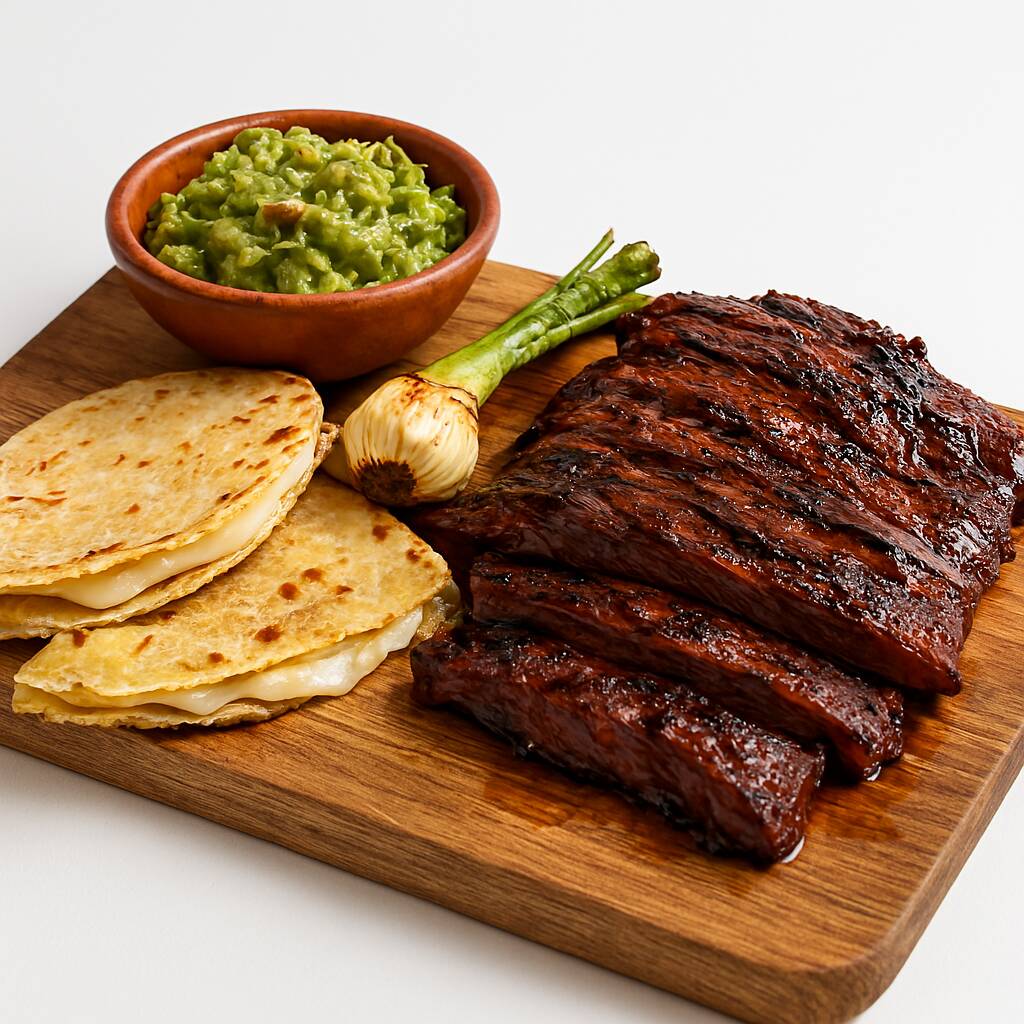 deliciosa carne de arrachera marinada acompañada de guacamole, cebolla cambray y quesadillas de manchego