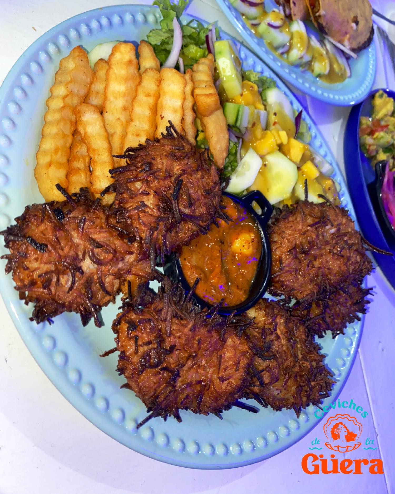 7 camarones empanizados con coco, acompañados de ensalada fresca con mango aderezo de mostaza miel, papas a la francesa y tortillas.