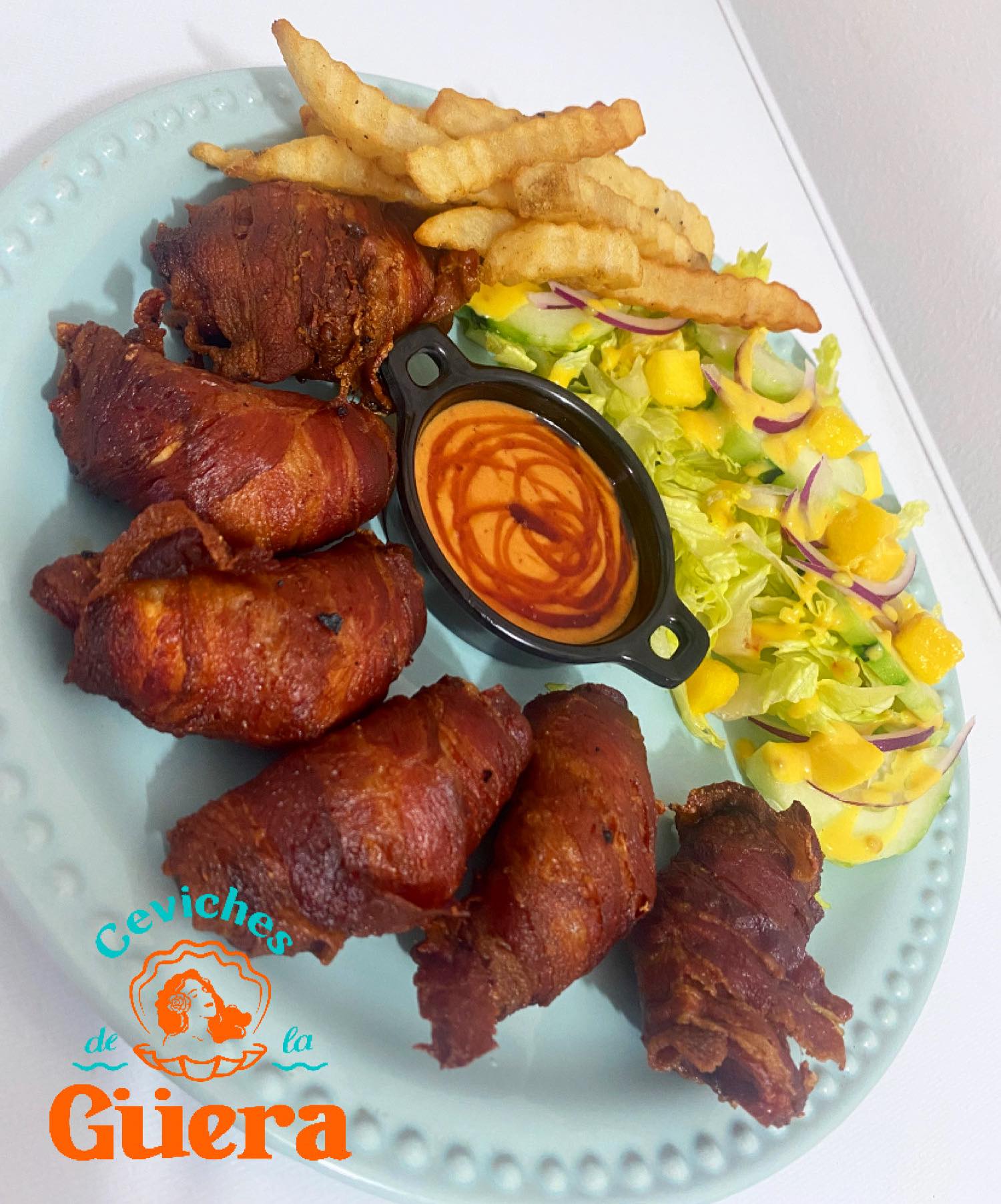 4 camarones dobles rellenos de queso Philadelphia envueltos en tocino, acompañados de enselada con mango y aderezo de mostaza miel, con papas a la francesa y tortillas.