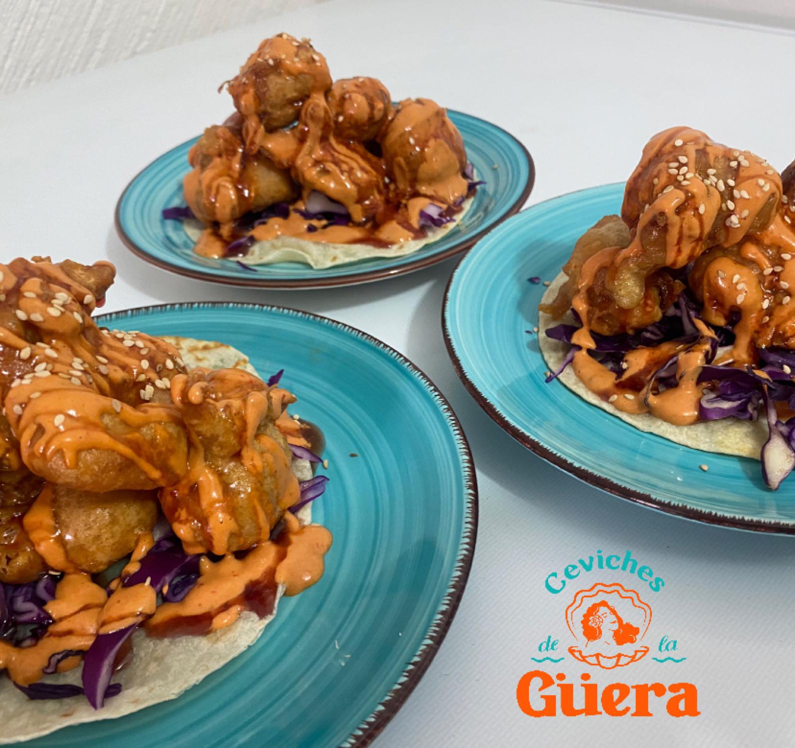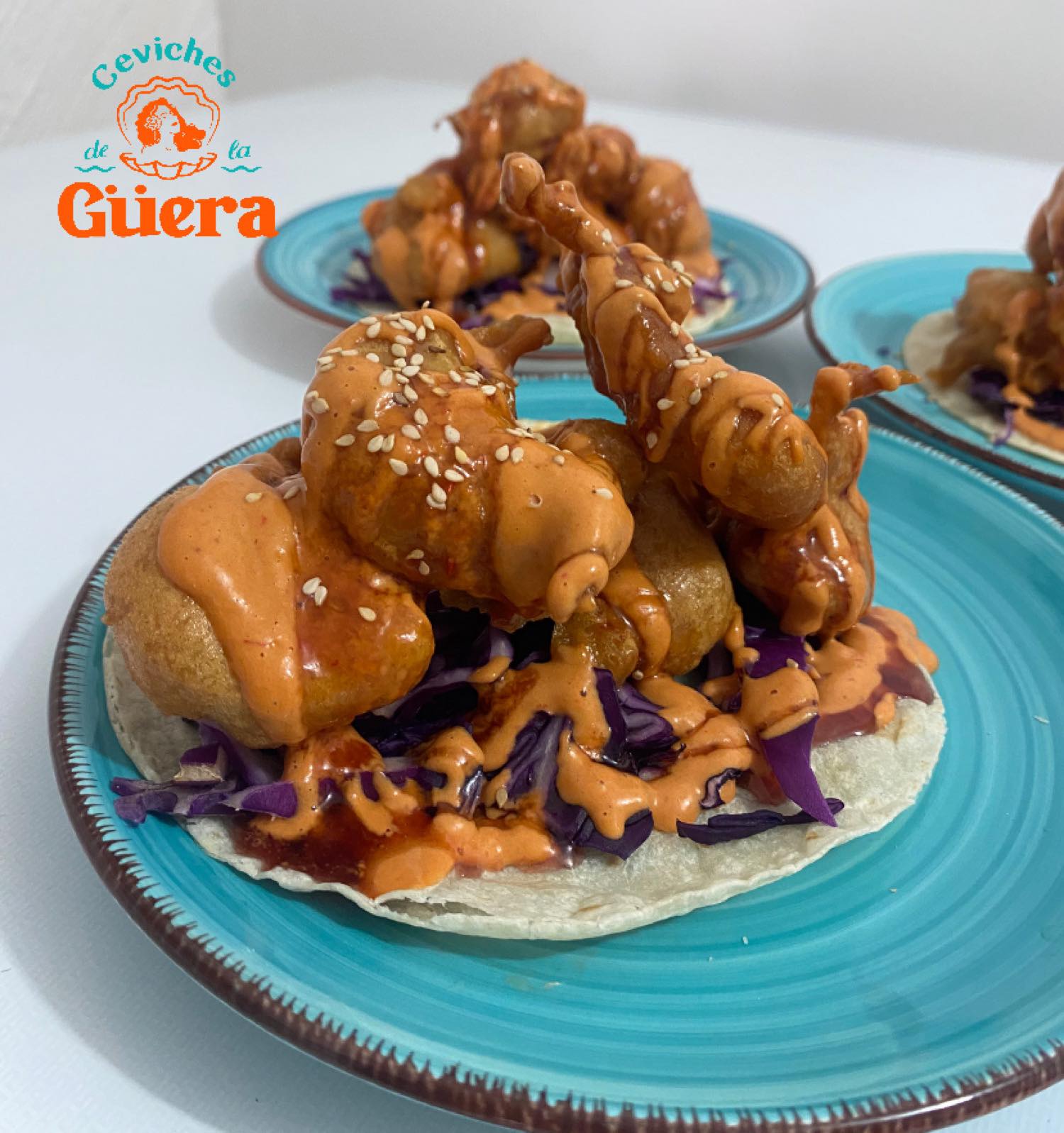 Nuestra clásica tostada de la güera pero en taco, col morada, camarones capeados, aderezo de chipotle y reducción de vino tinto