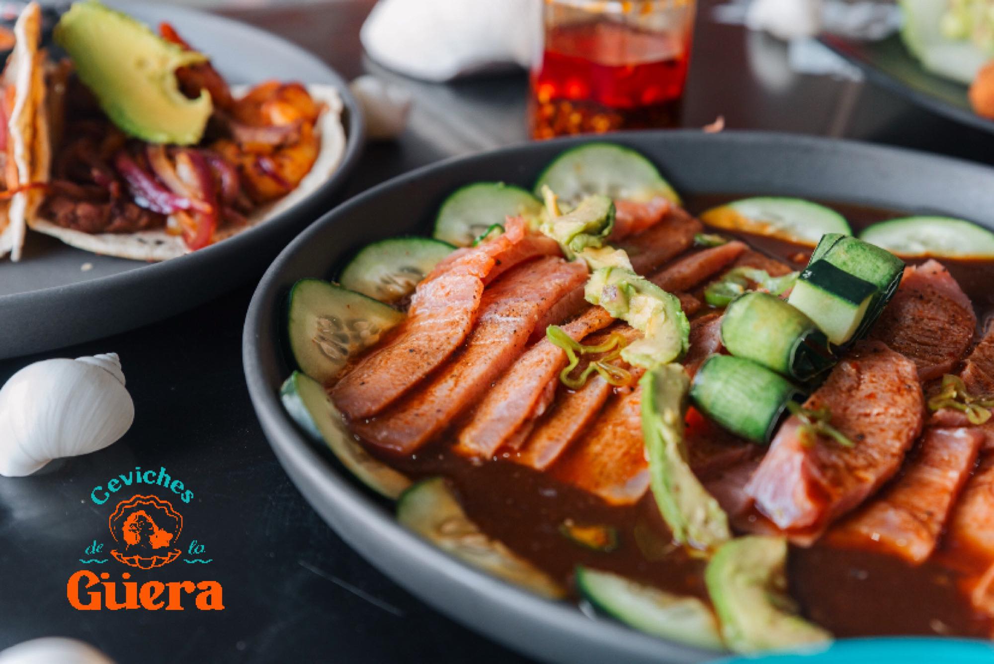 Camarón, pepino, limón y salsas negras