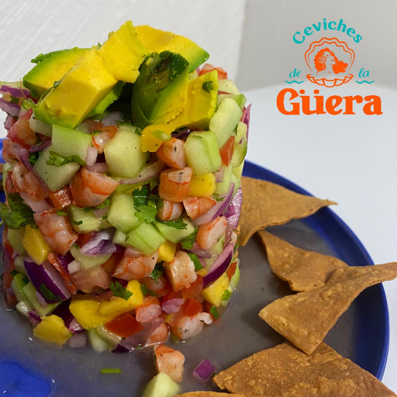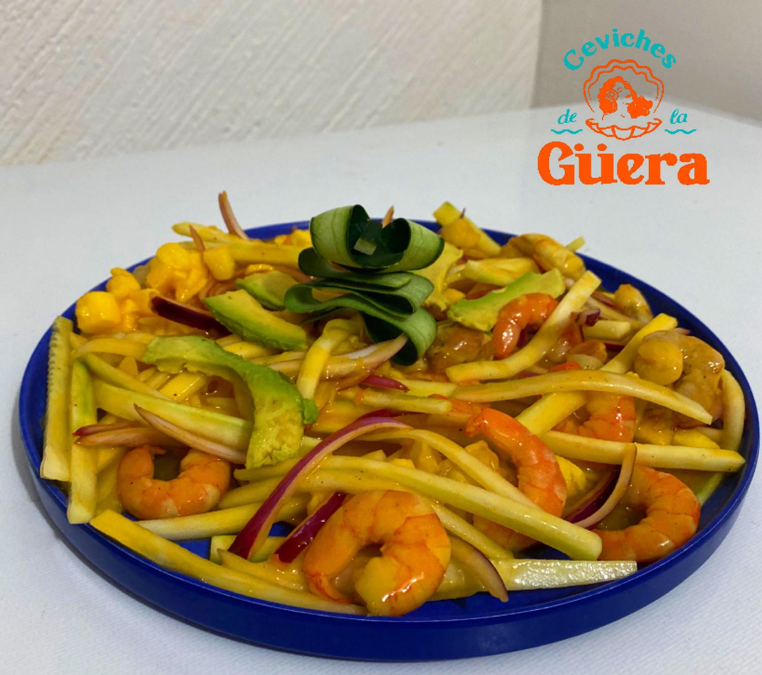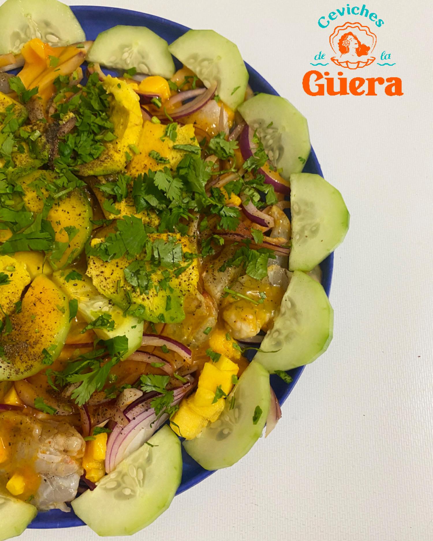 Camarón, pepino, limón y salsa de mango con trozos de mango