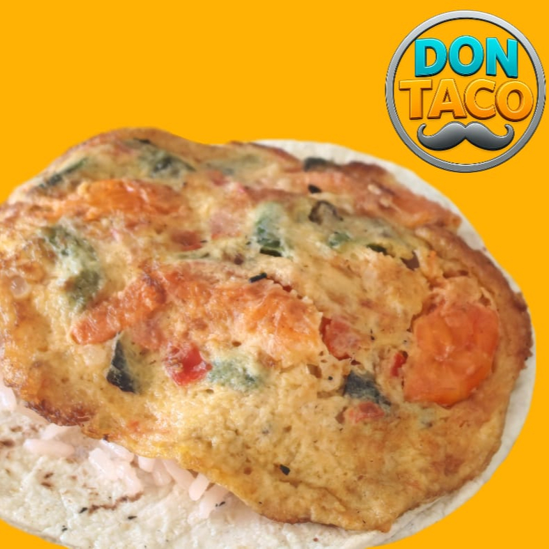 TORTITA DE HUEVO CON CAMARON SECO, CON PIMIENTO Y CEBOLLITA. SERVIDA SOBRE ARROZ ROJO