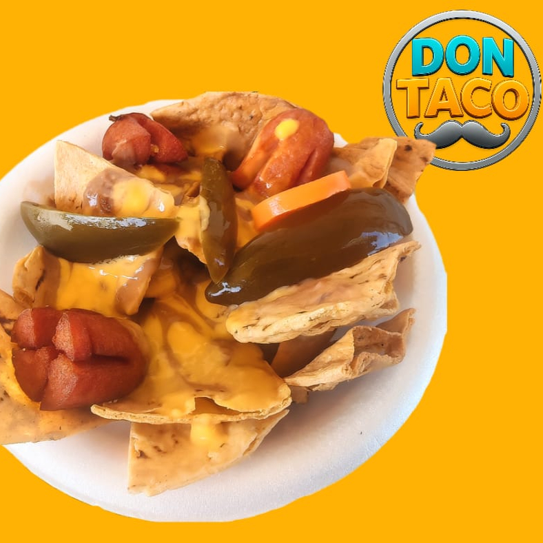 TOTOPOS CRUJIENTES BAÑADOS CON QUESO AMARILLO DERRETIDO Y FRIJOLITOS, ACOMPAÑADOS DE SALCHIPULPO Y CHILE JALAPEÑO