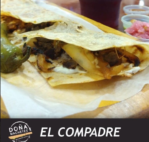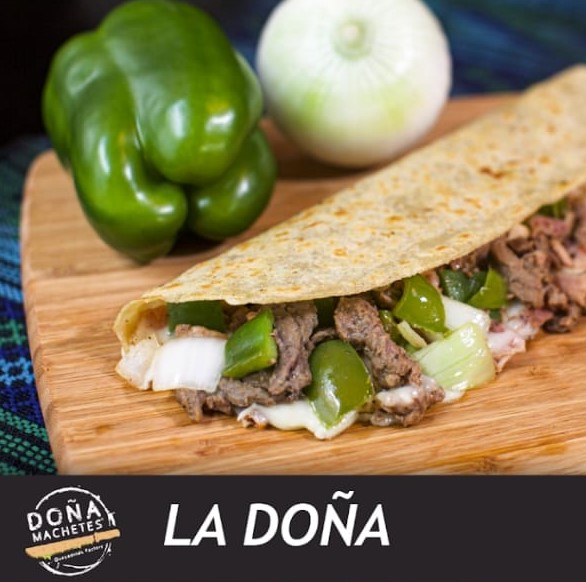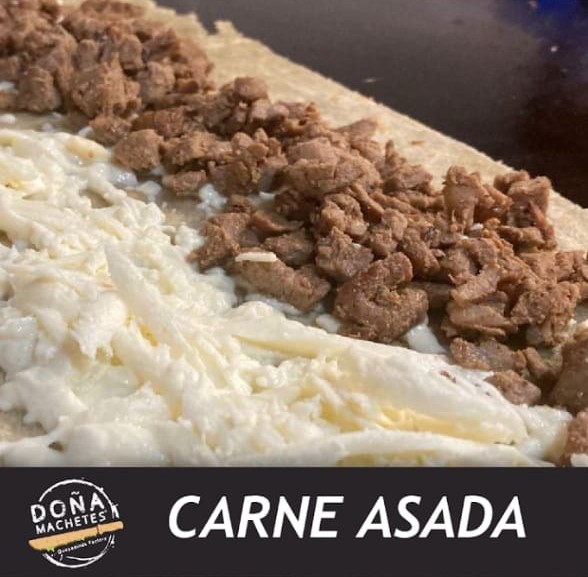 Carne asada, cebolla, pimiento, tocino y quesillo. Machete de 60 cm.