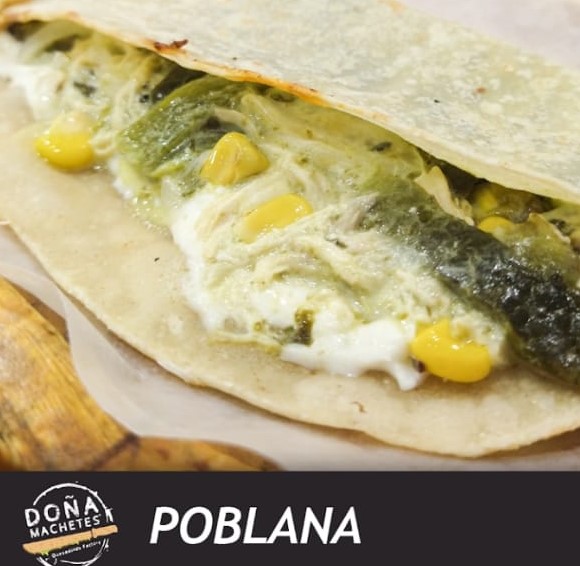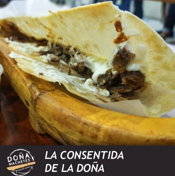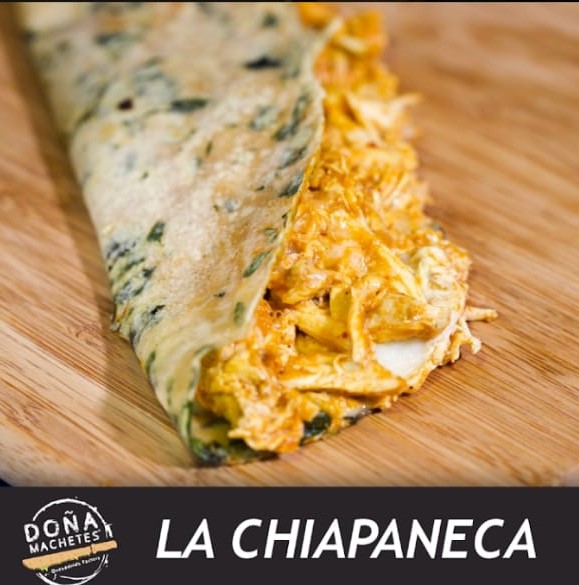 Tortilla con chipilín, pechuga de pollo deshebrada, salsa especial chiapaneca y quesillo. Machete de 60 cm.