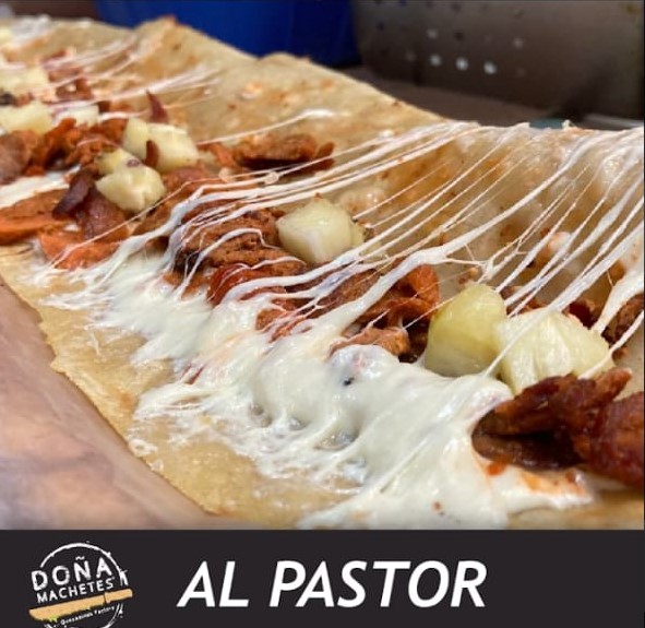 Carne al pastor, piña y quesillo. Machete de 60 cm.
