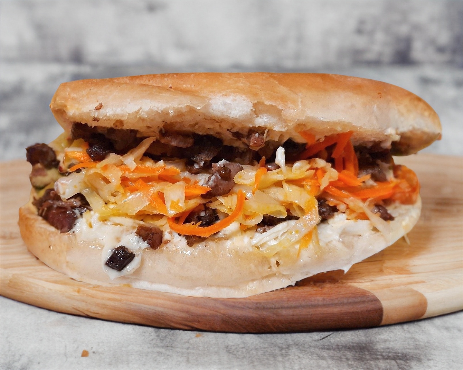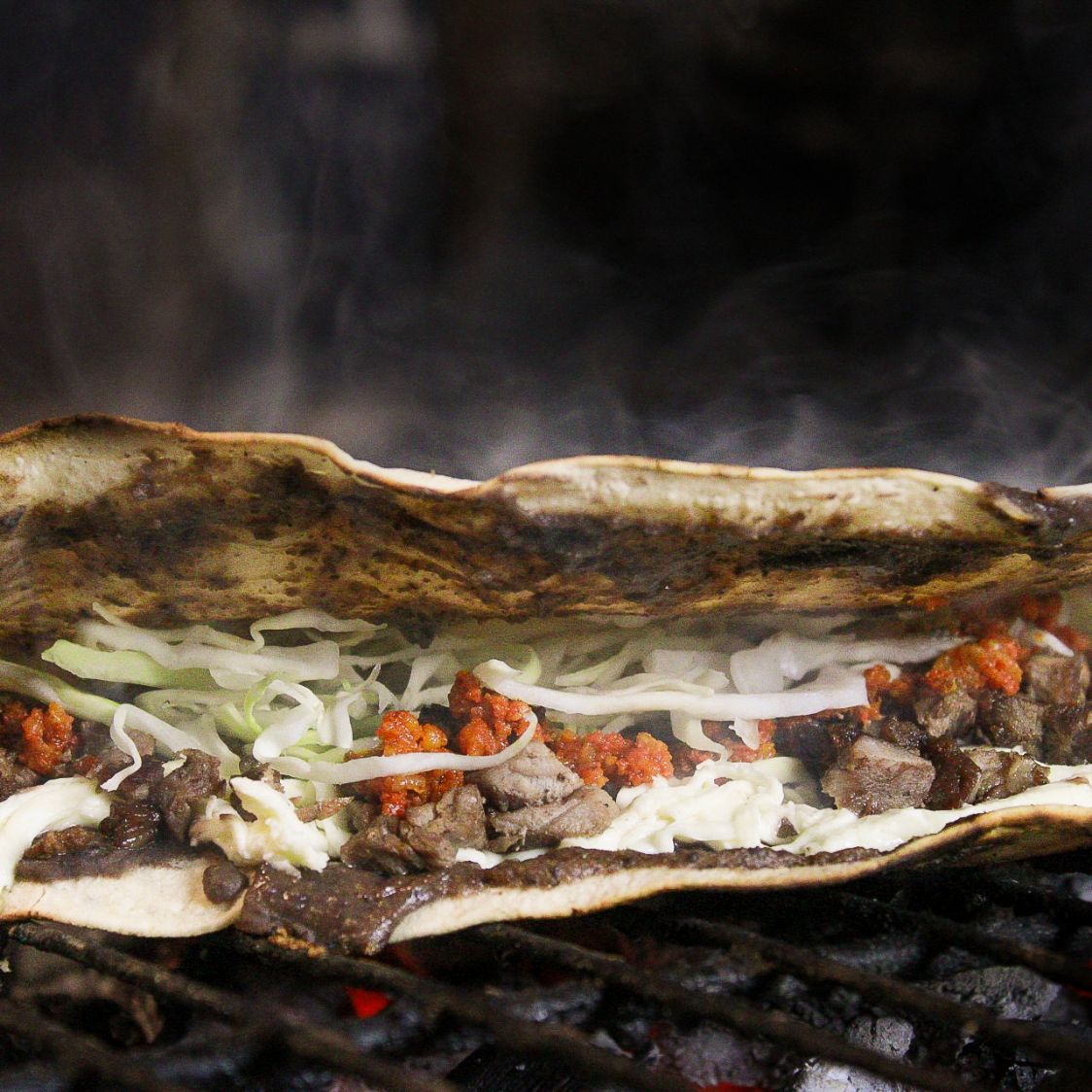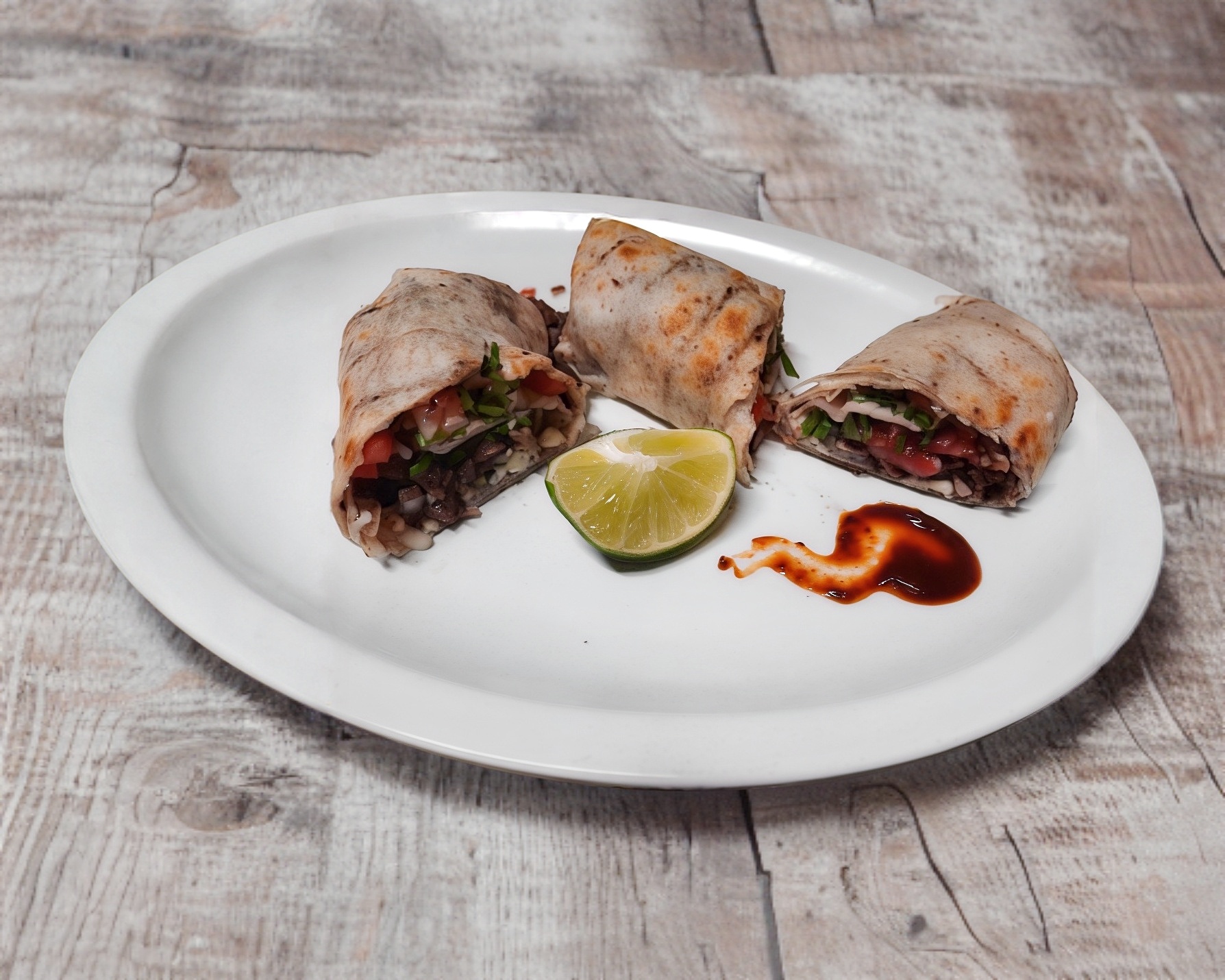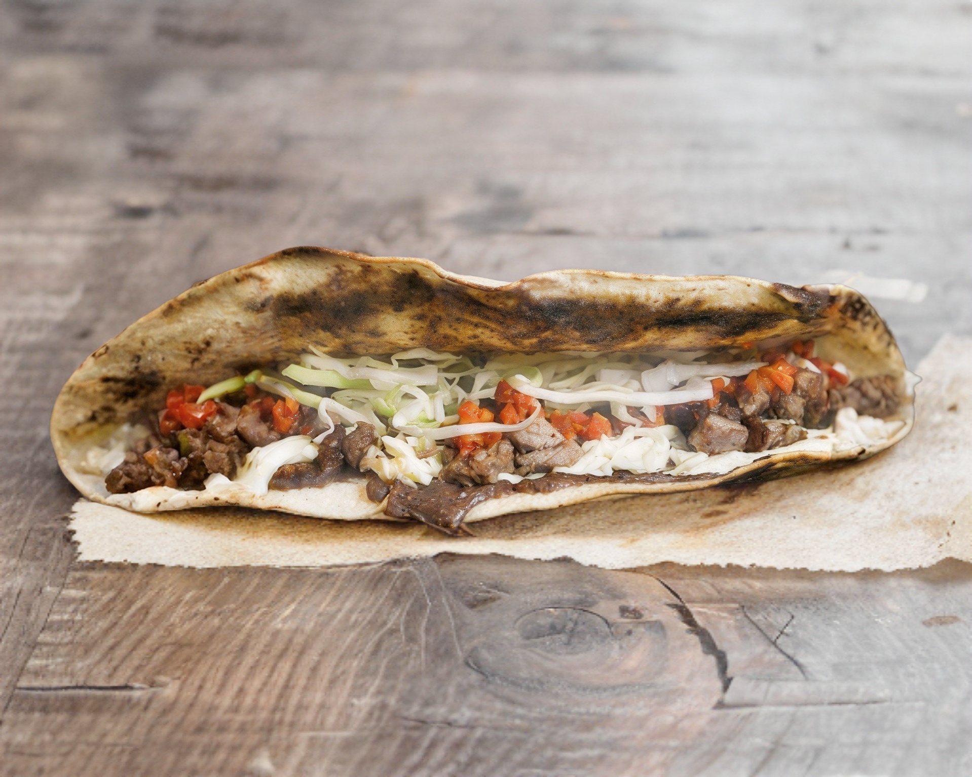 Tortilla de harina rellena de frijol, carne asada, quesillo, tomate, cebolla y lechuga.