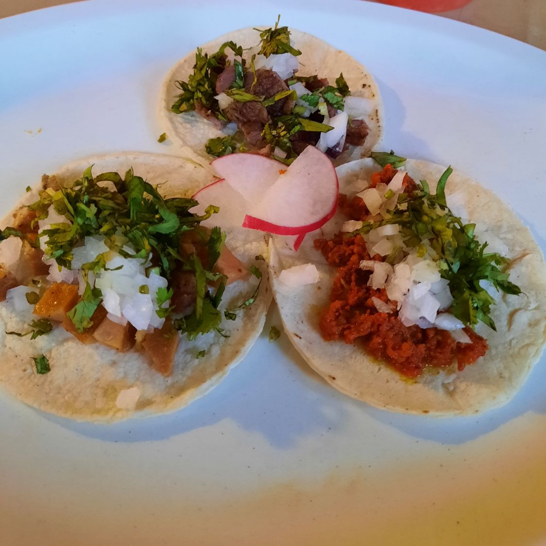 Taco de carne asada acompañado con cebolla y cilantro. Incluye salsa.