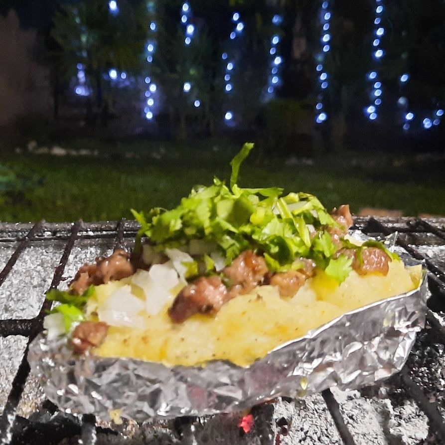 Papa rellena con carne asada, acompañada con cebolla y cilantro.