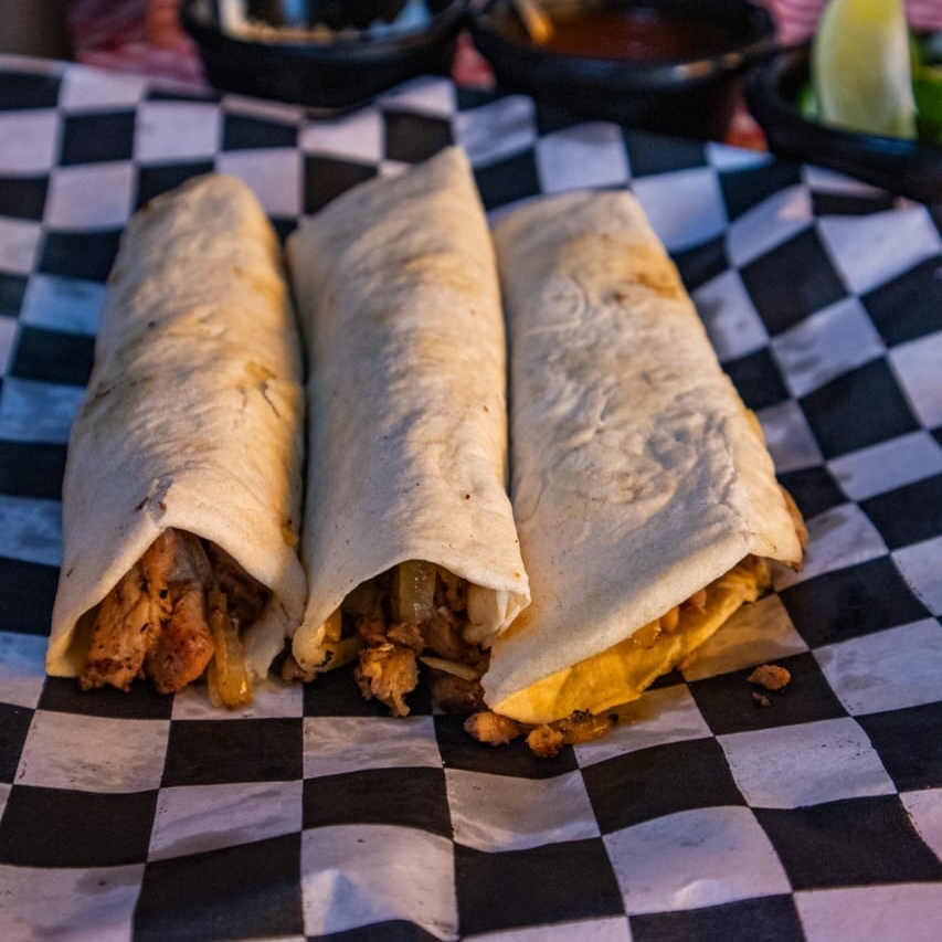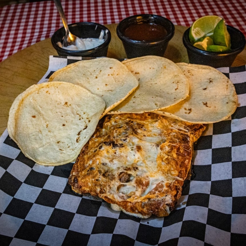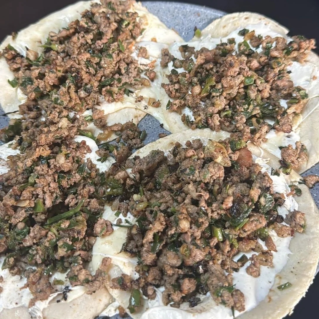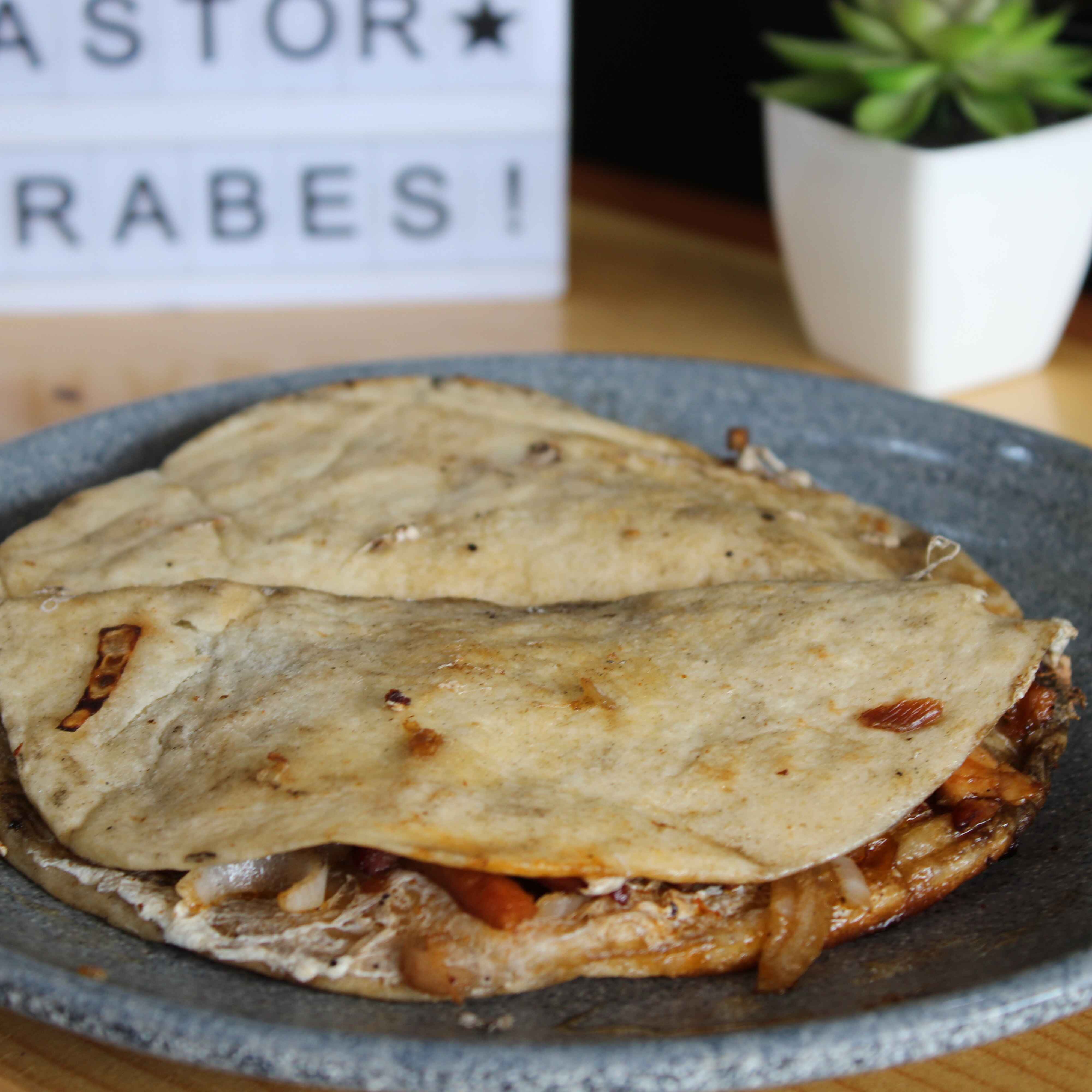 Pan de torta, costra de queso, carne Árabe, cebolla y aguacate