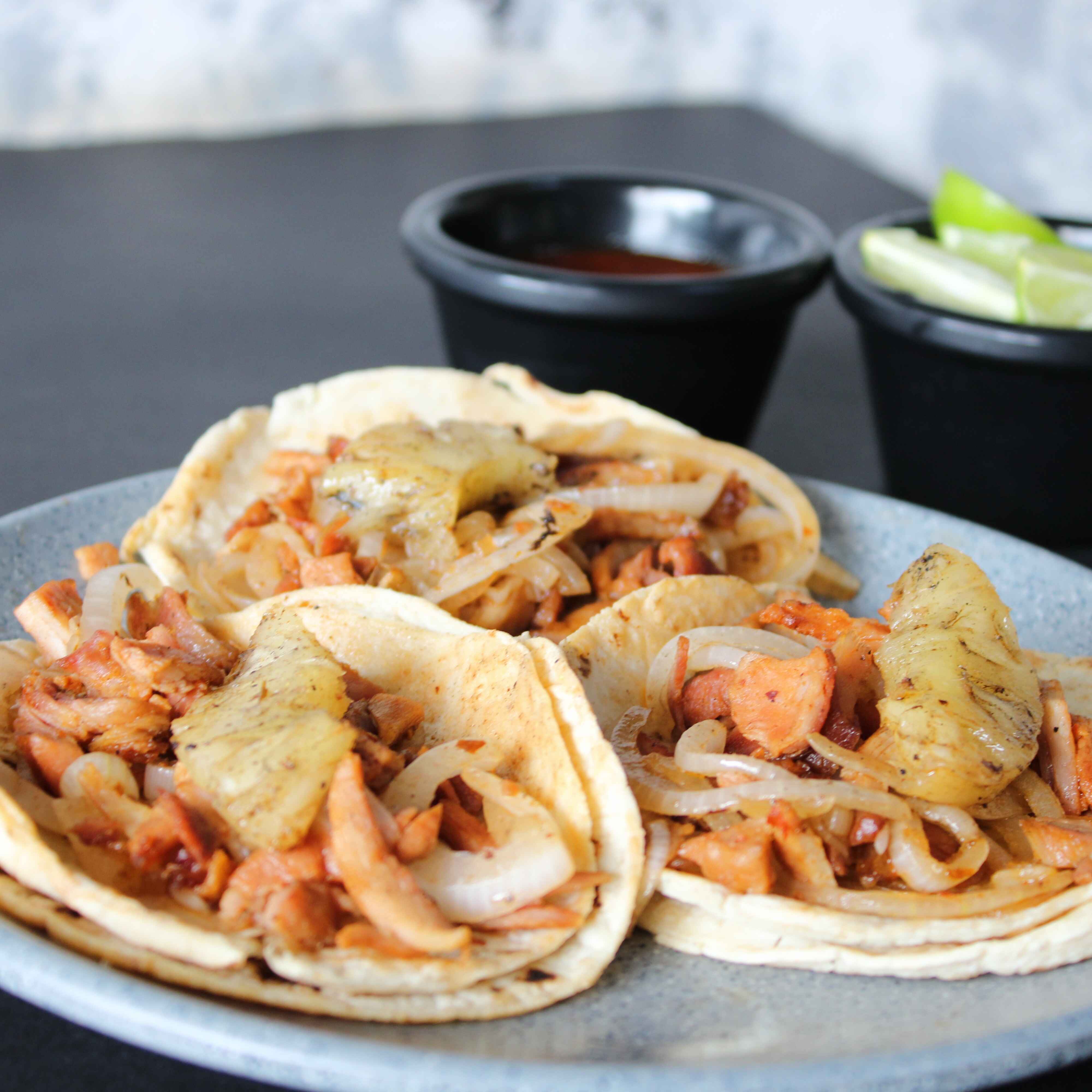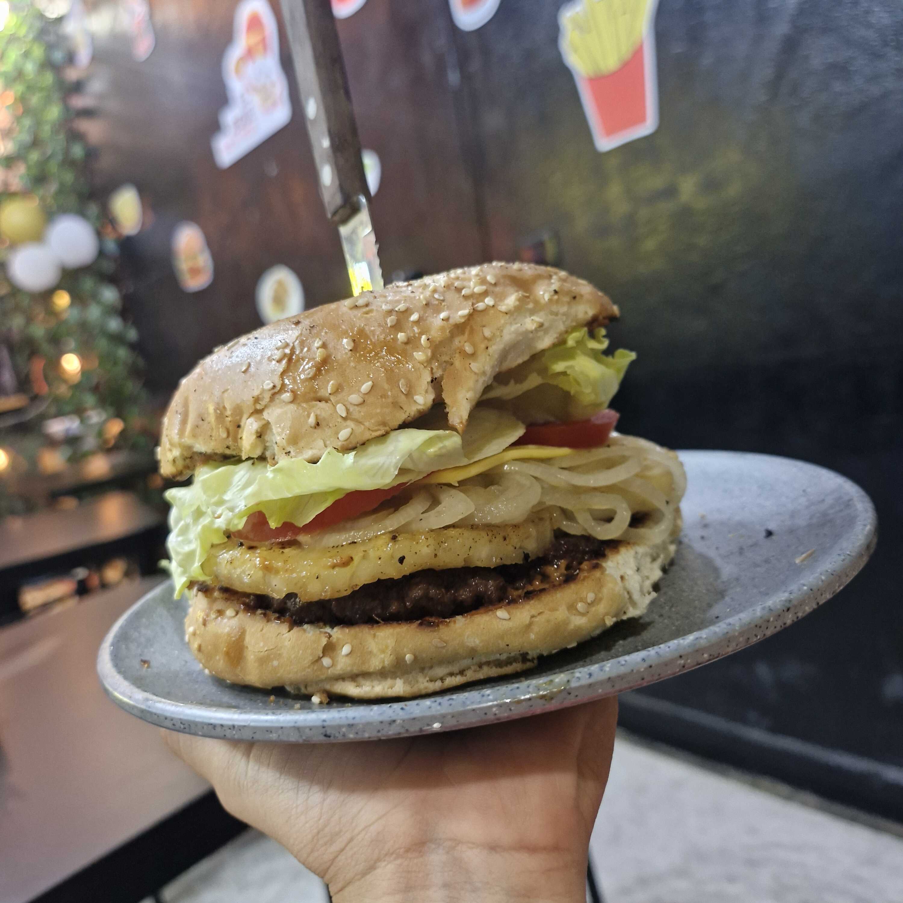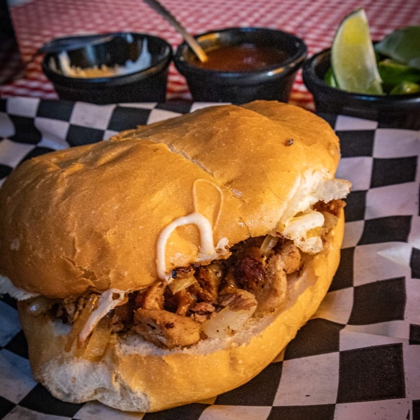 Pan de torta, costra de queso, carne pastor, piña, cebolla y aguacate