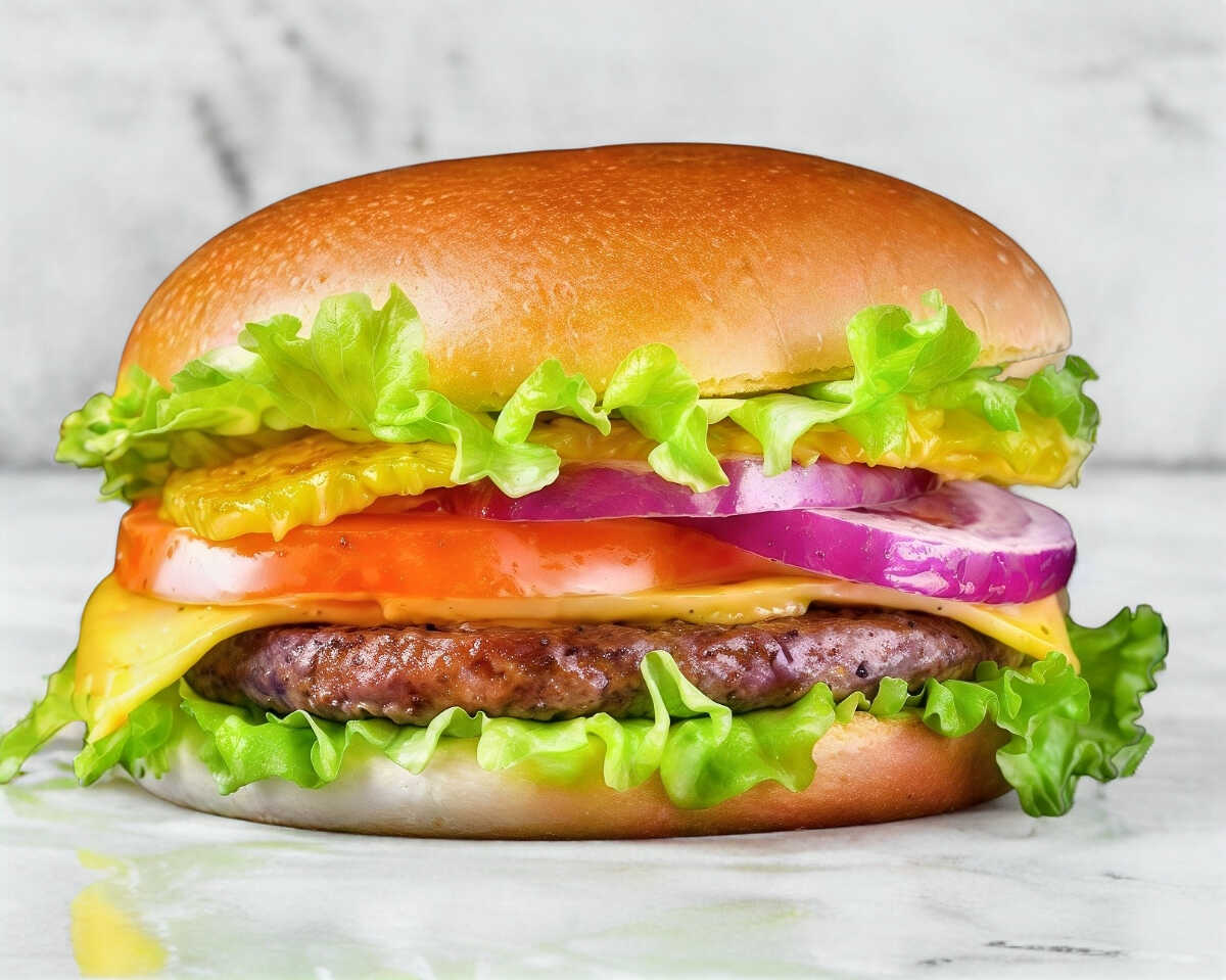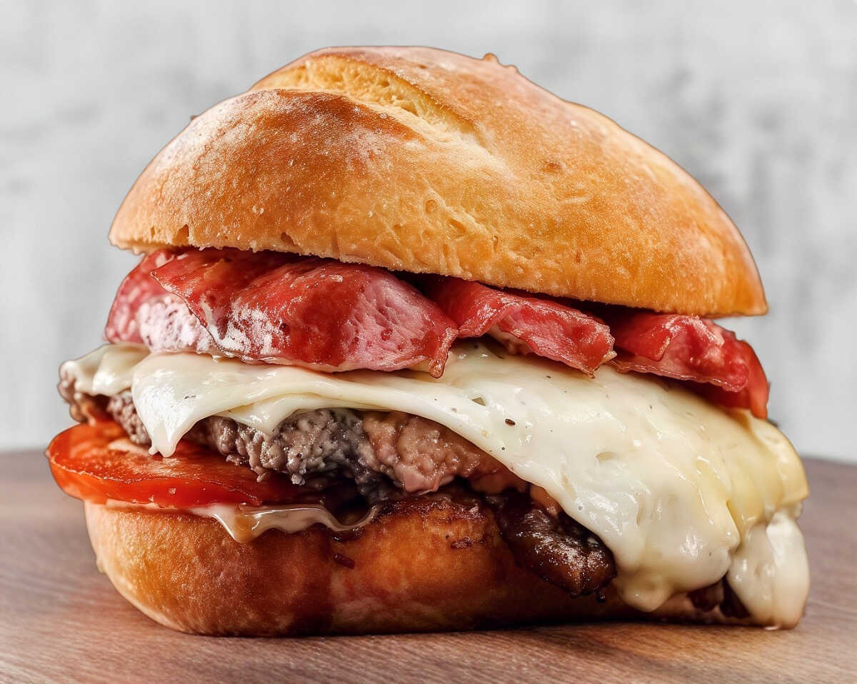 Lleva carne de 150gr, queso amarillo, tocineta, jamón, tomate, cebolla y lechuga