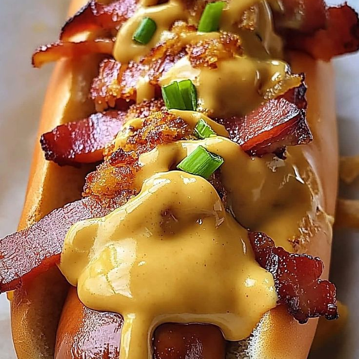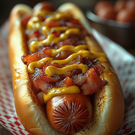 Deliciosos pan de hot Dog, con salchicha polaca con res, Y tocino frito.