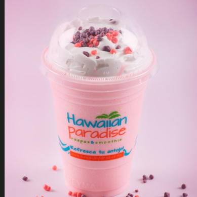 Hielo granizado, con jarabe sabor fresa, en vaso de 14 oz.