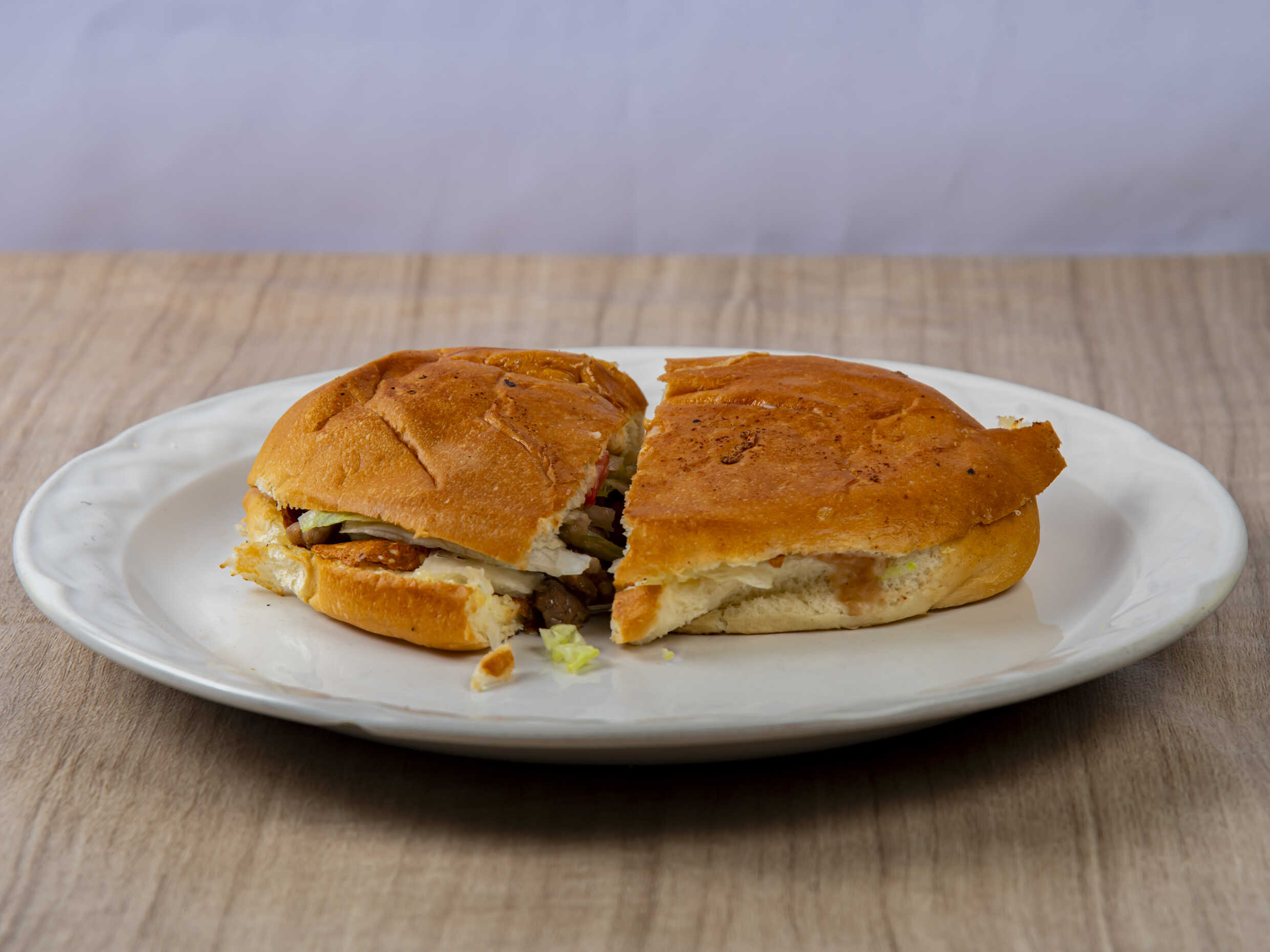 2 Rebanadas de pan con pollo, queso, tomate, lechuga, cebolla y aguacate.
