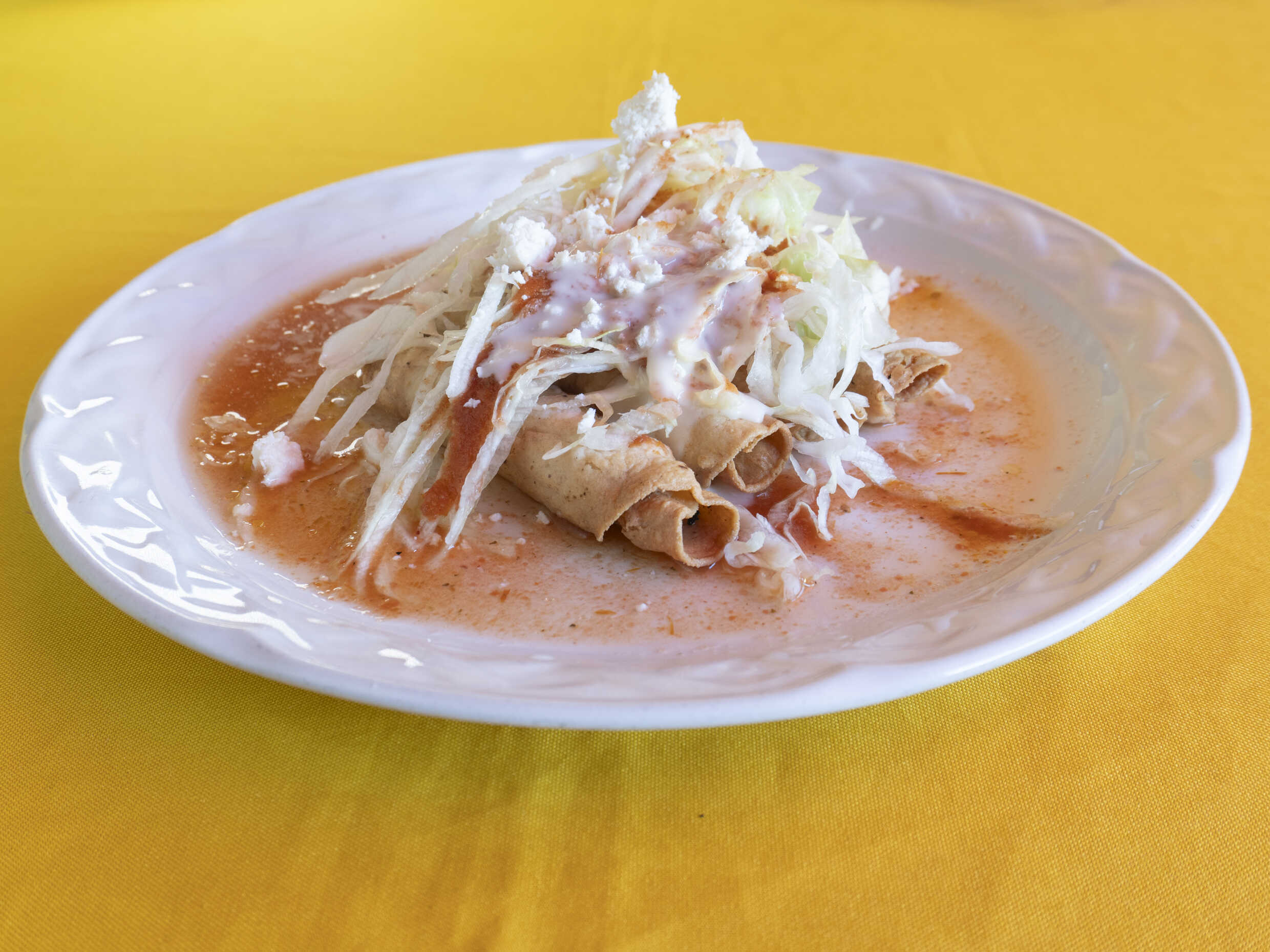4 Tacos fritos de pollo o quesillo con su salsita, lechuga, crema y queso.
