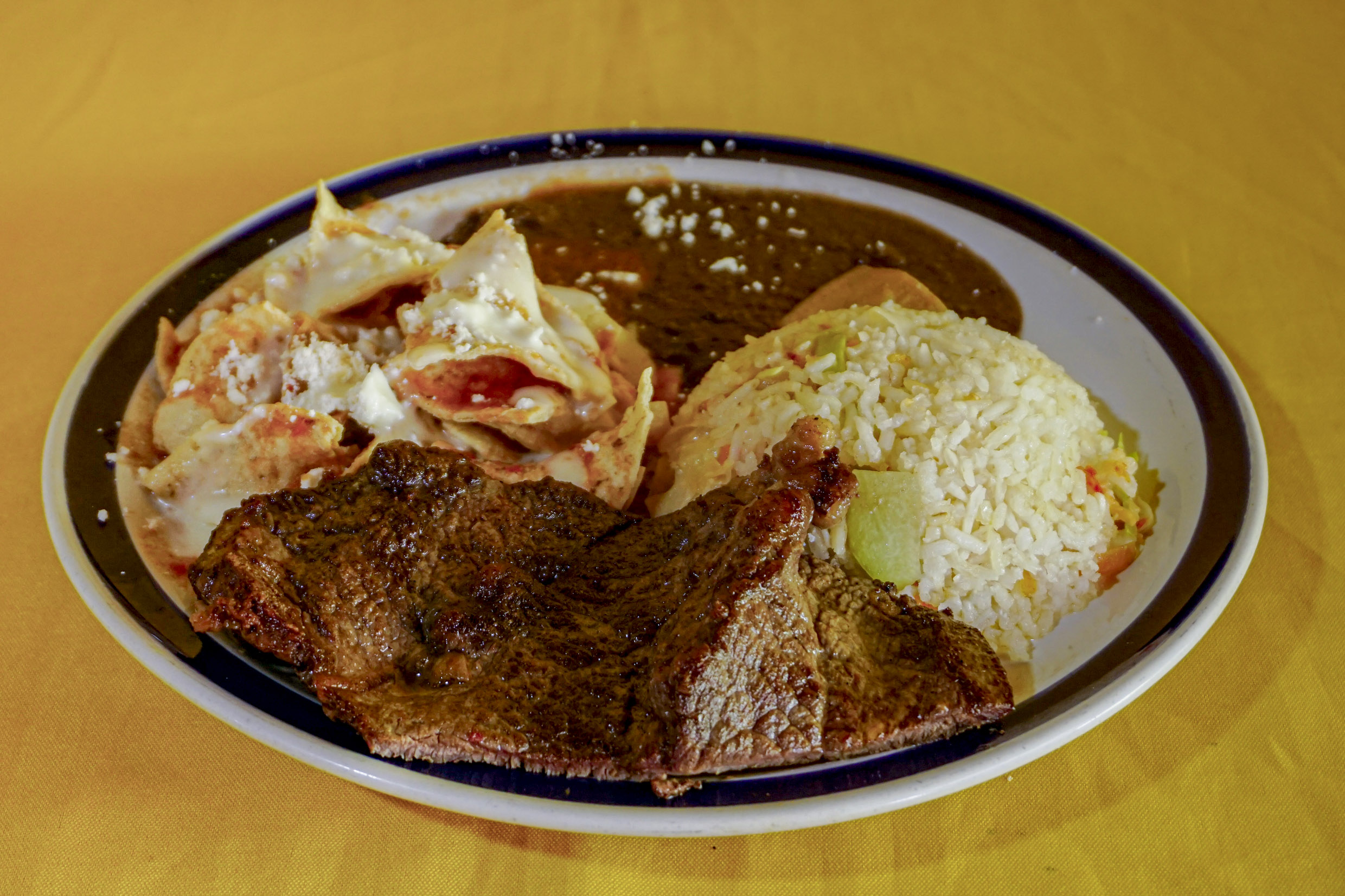 Filete de res acompañado con huevos estrellados, 2 quesadillas, pico de gallo, frijoles y plátanos fritos.
