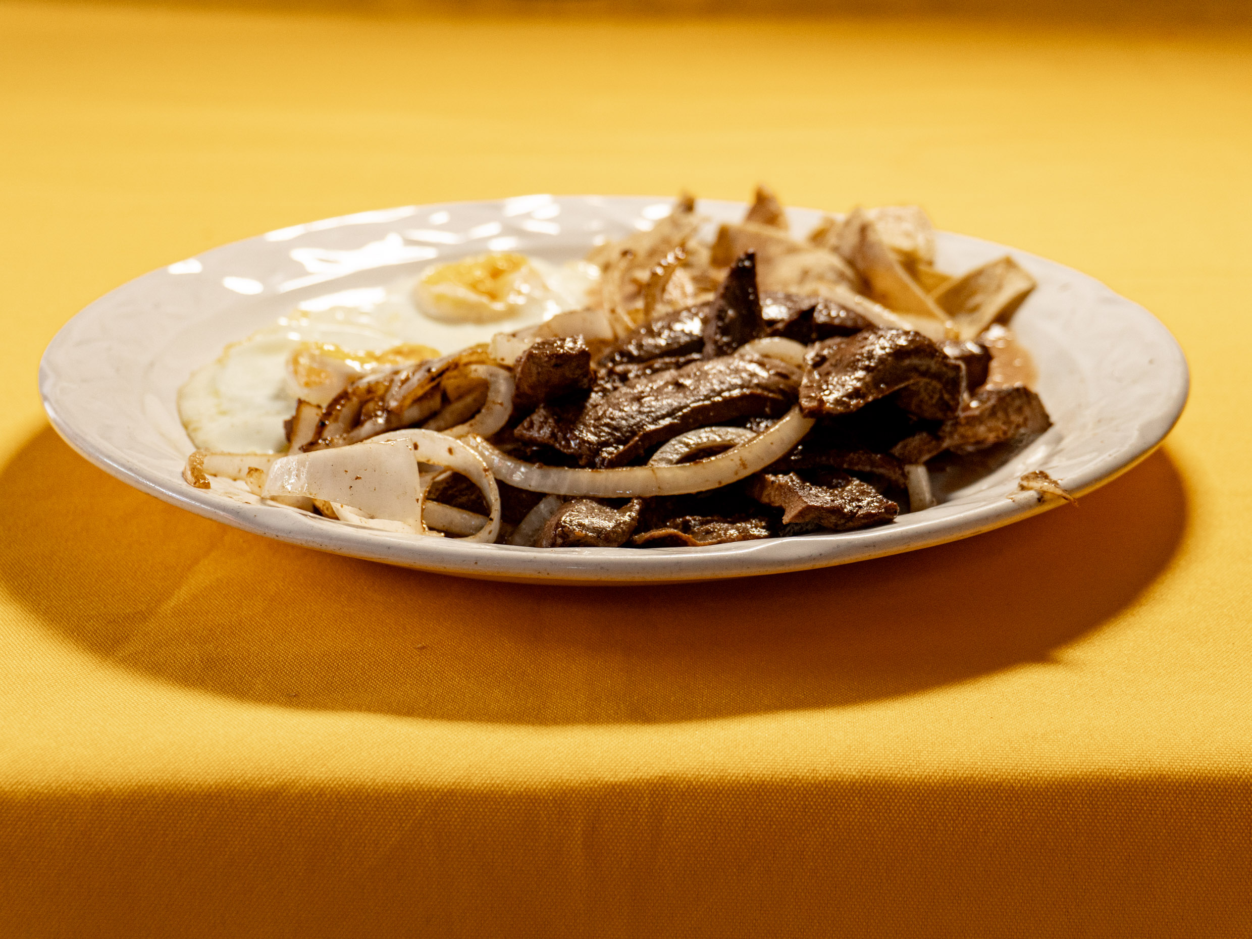 Higado encebollado y 2 huevos estrellados, frijoles con totopos, café y jugo de naranja.