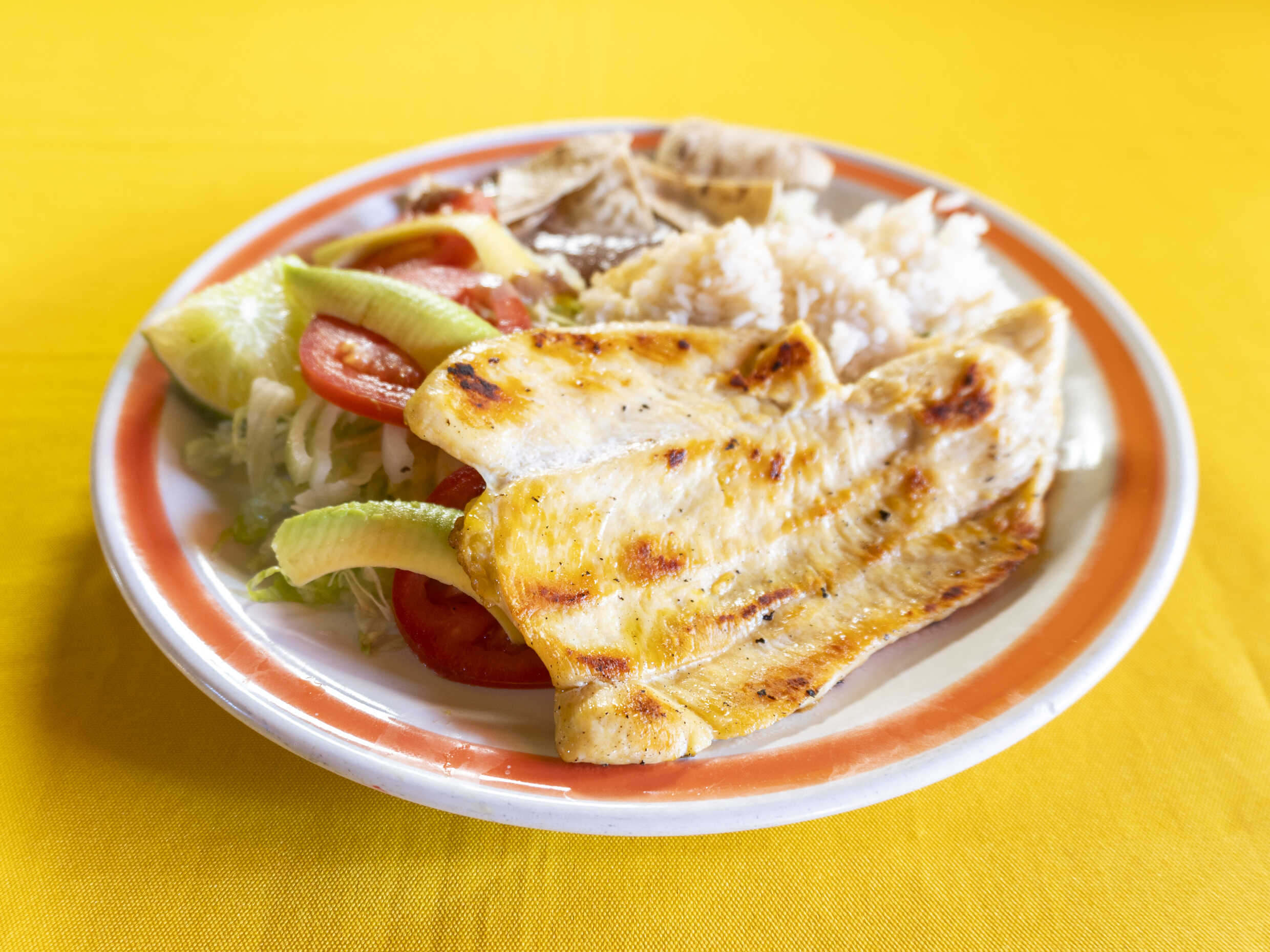 Pechuga a la plancha cubierta de queso blanco, acompañada de ensalada verde y frijoles. Incluye 1 frappe de frutas.