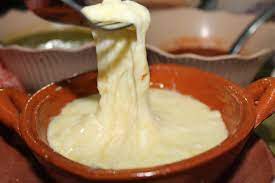 Delicioso queso blanco derretido con tortillas y frijoles.