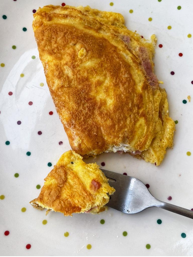 Omelette de queso con jamón, café negro y jugo de naranja.