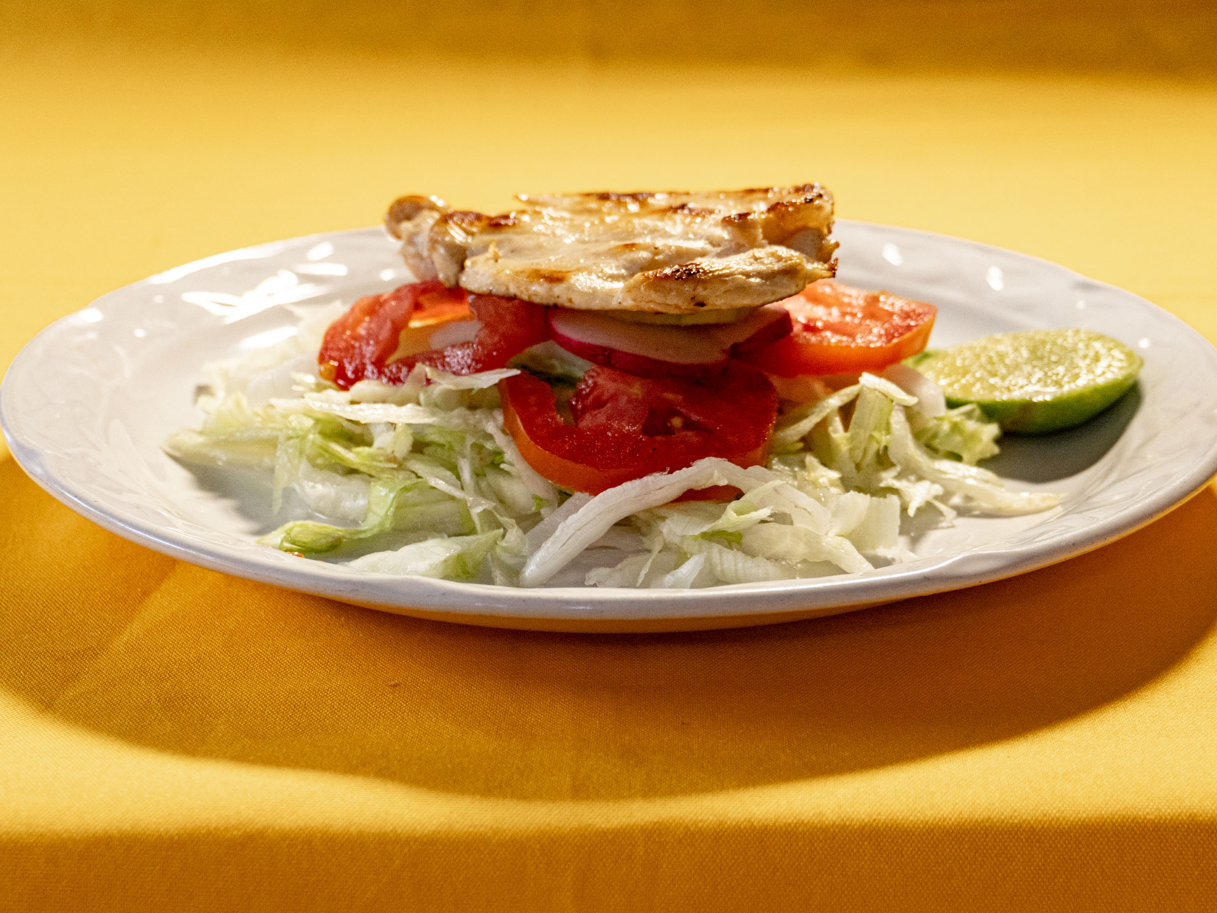 Acompañado con huevos estrellados, ensalada verde y frijoles.