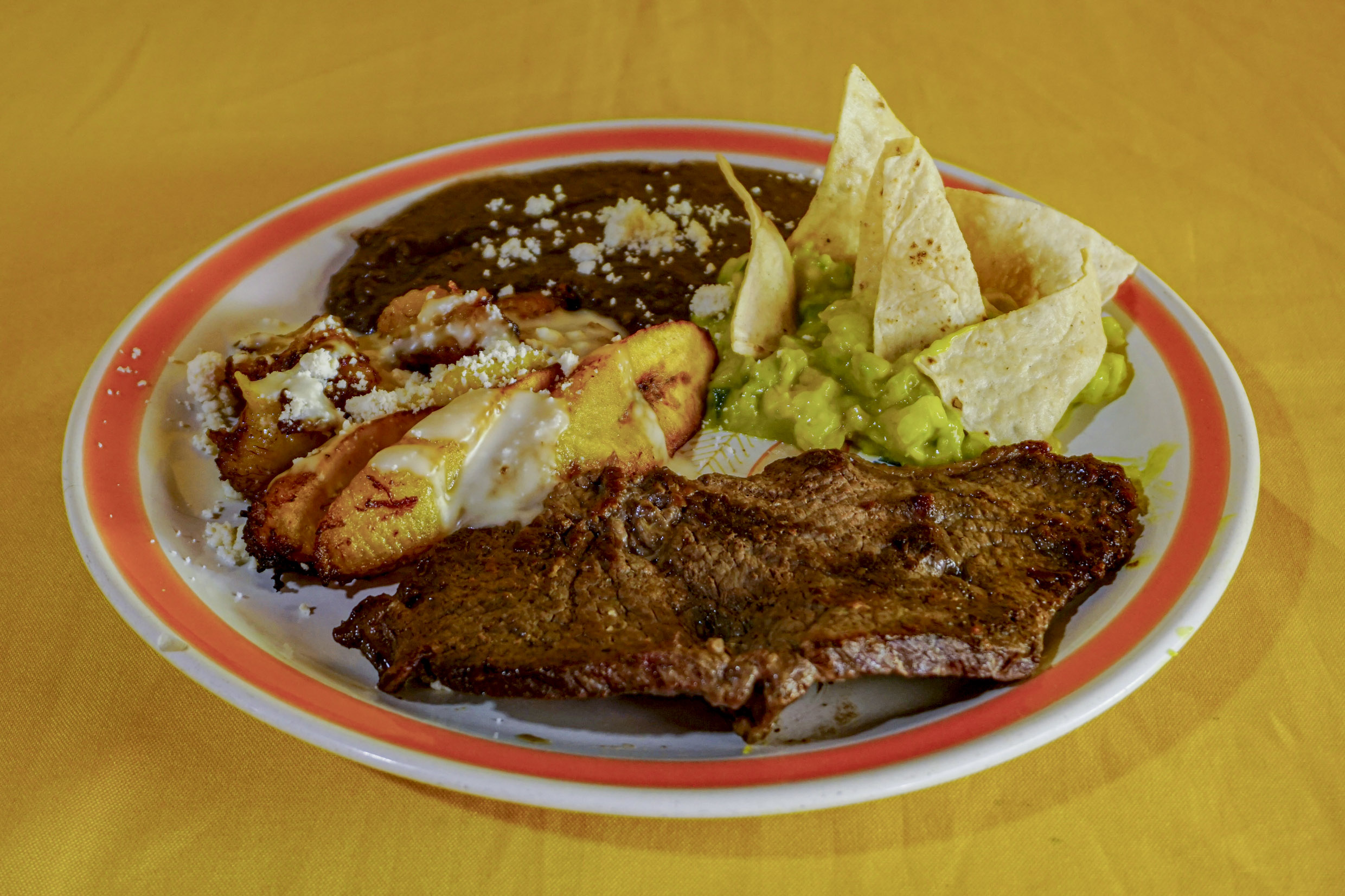 Filete de res acompañado con frijoles fritos, guacamole, plátanos fritos, totopos, queso y crema. (Porción personal)