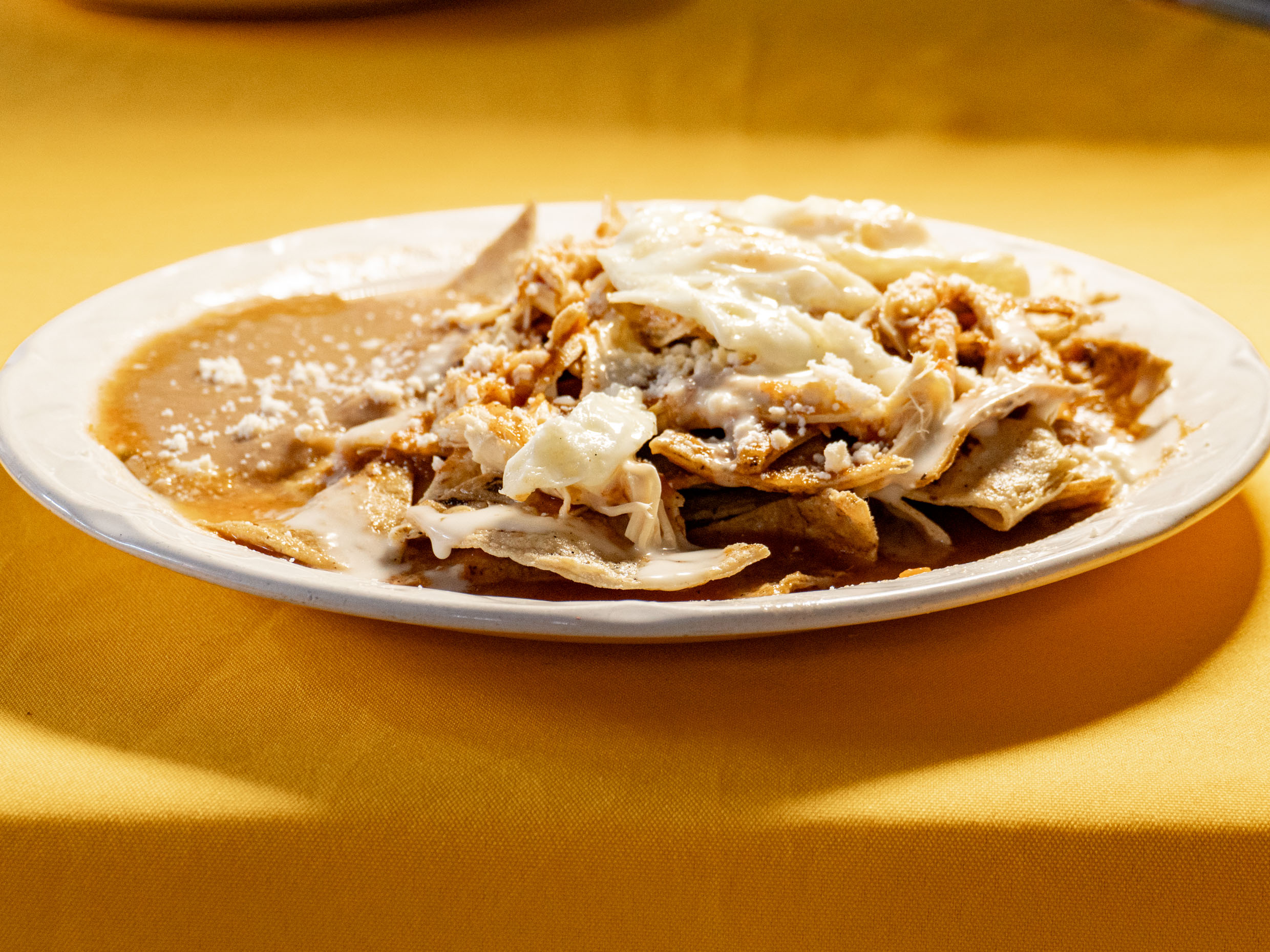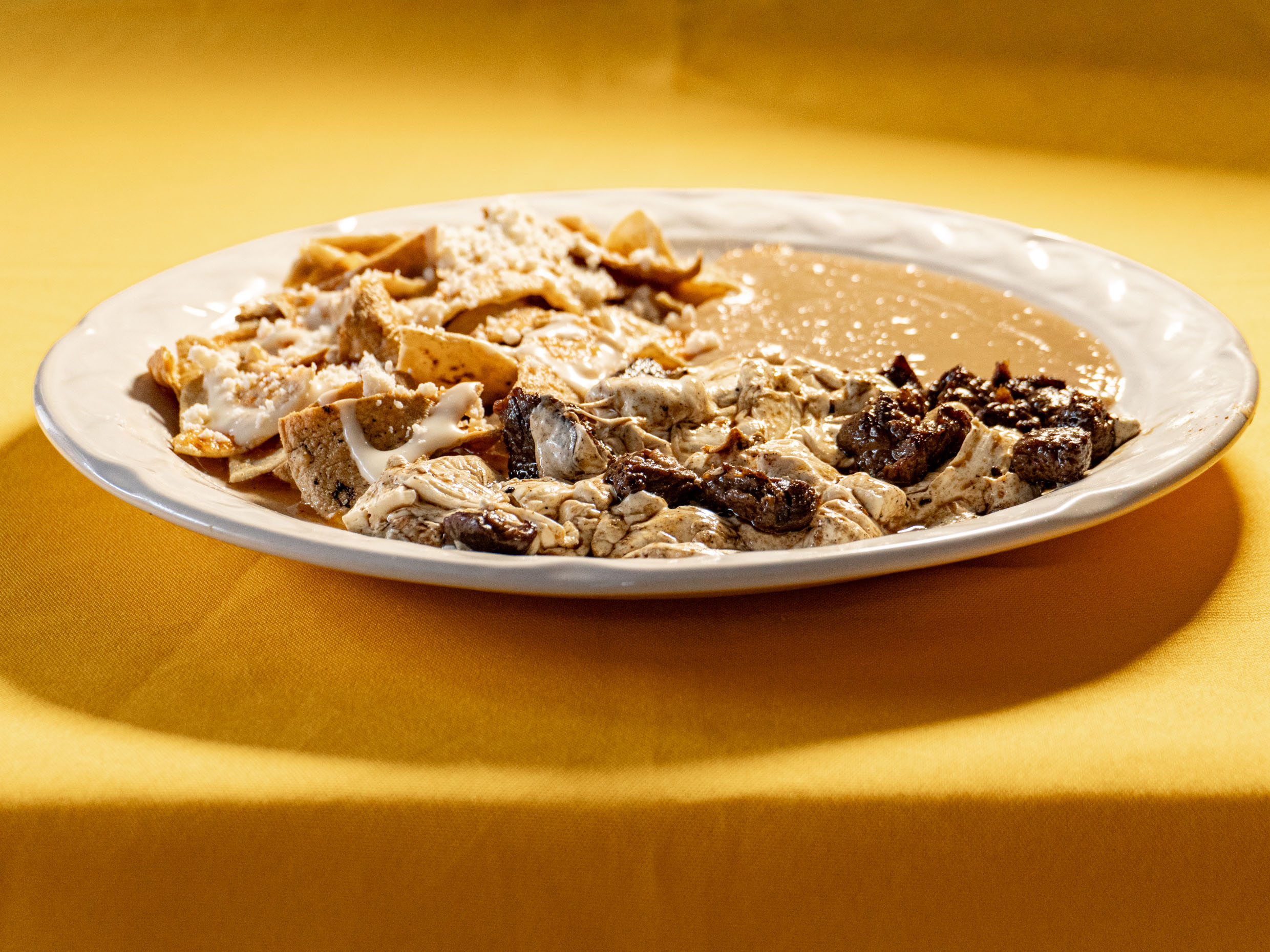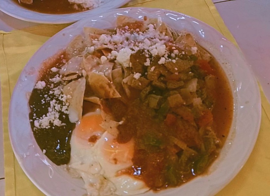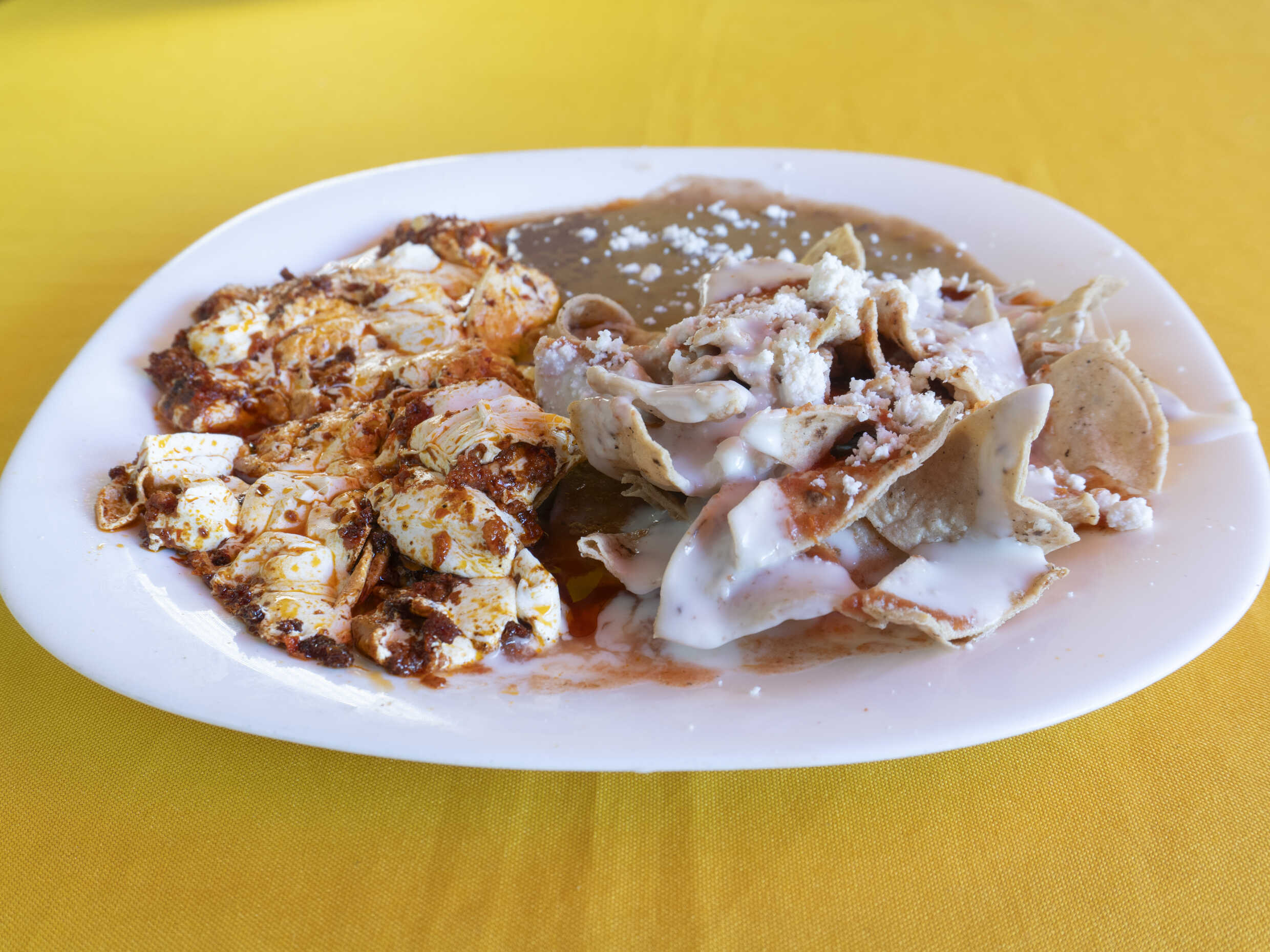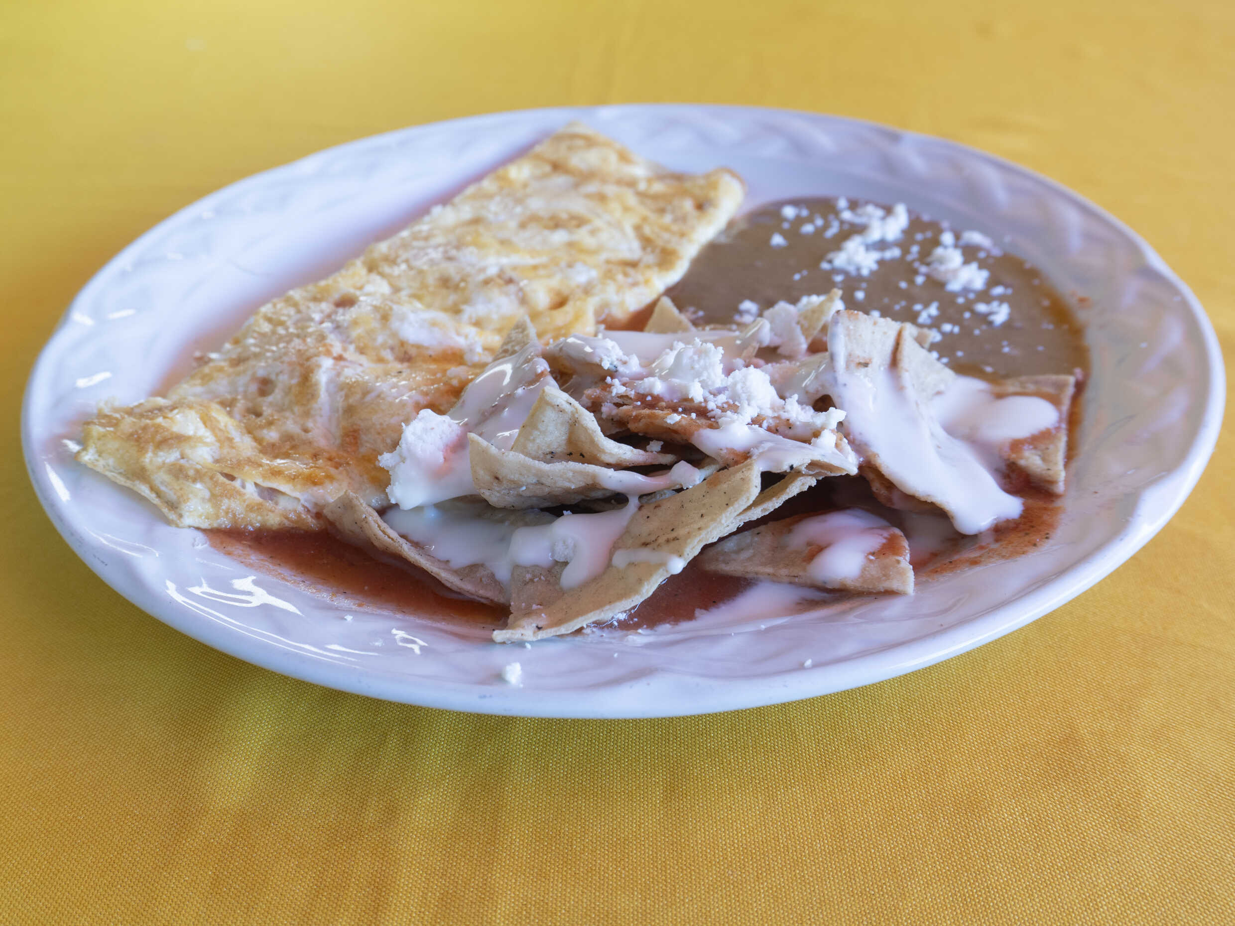 Acompañada de huevos estrellados, frijoles, chilaquiles con pollo, queso y crema.