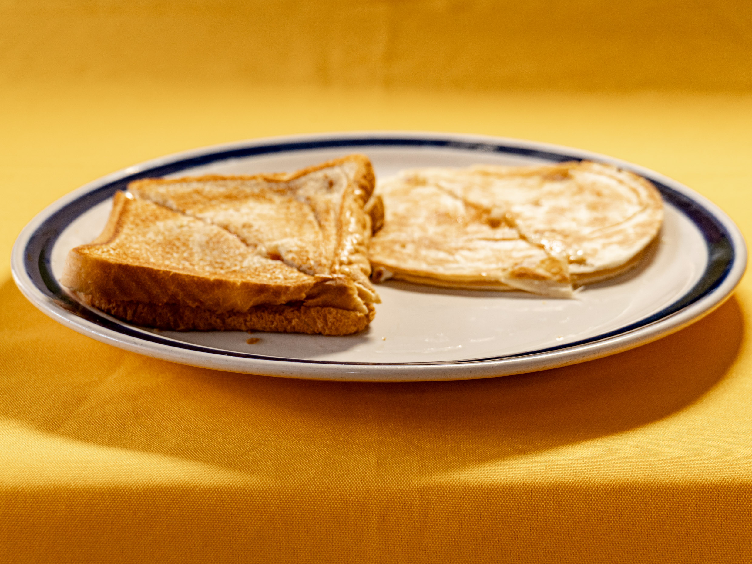 Con queso fundido encima, acompañado de frijoles y ensalada verde.