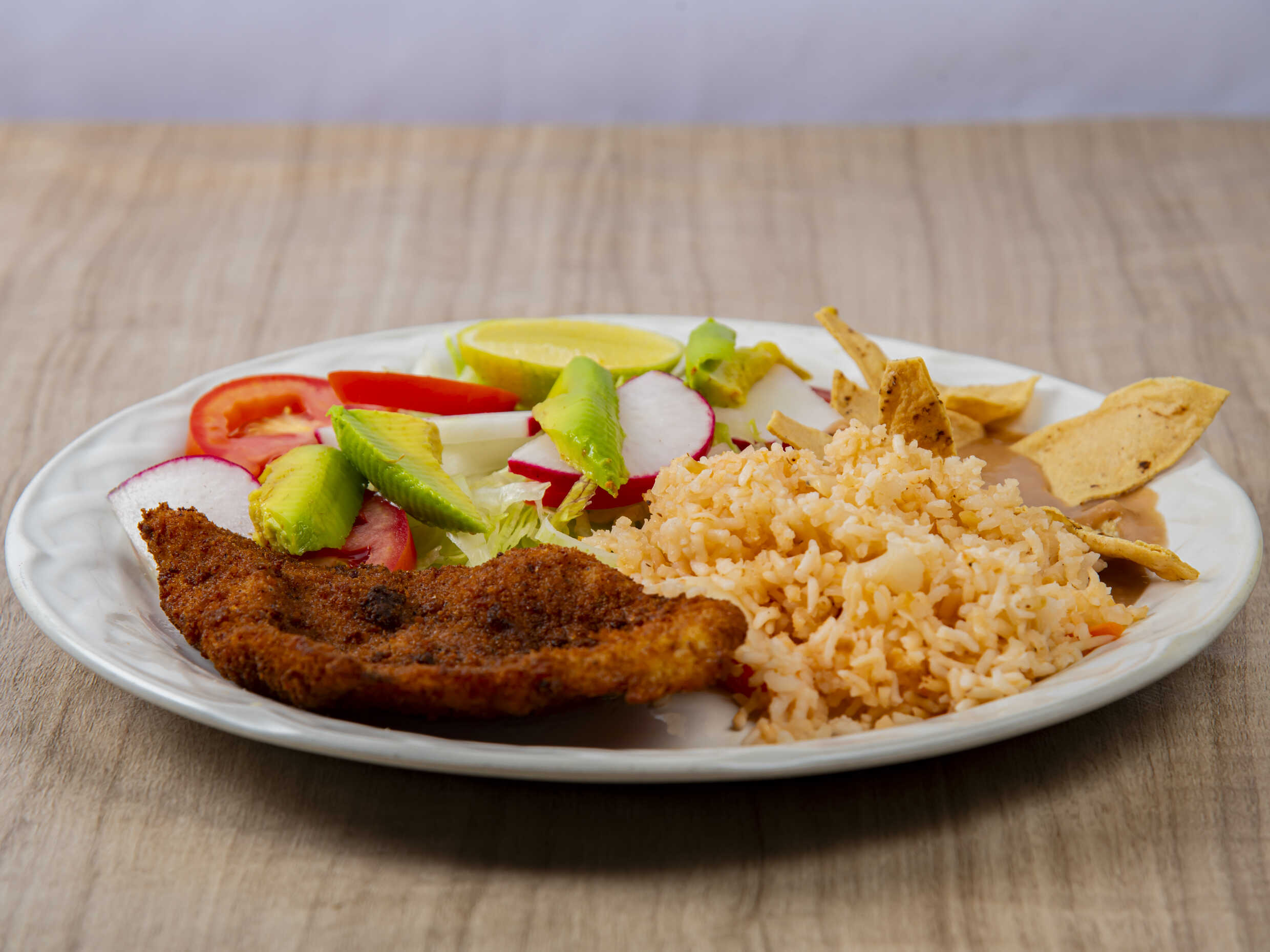 Milanesa de res empanizada cubierta de queso gratinado acompañada de huevos estrellados con chilaquiles y frijolitos. Incluye 1 frappe de frutas.