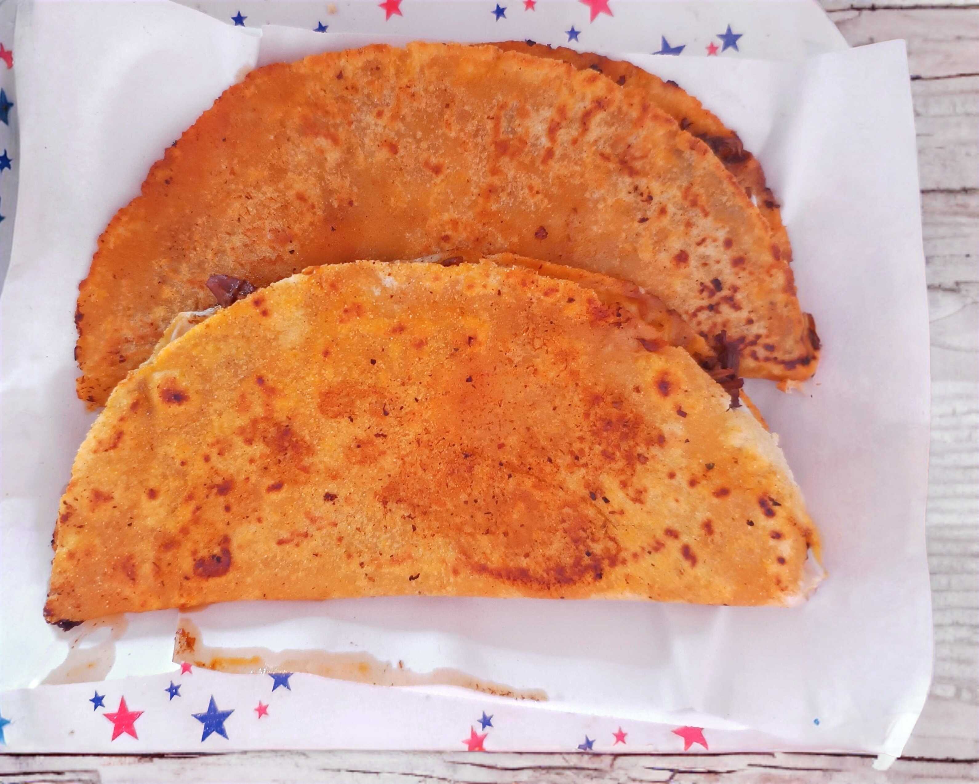 Tortillas de harina hechas a mano marinadas y doraditas con costra de quesillo y birria
