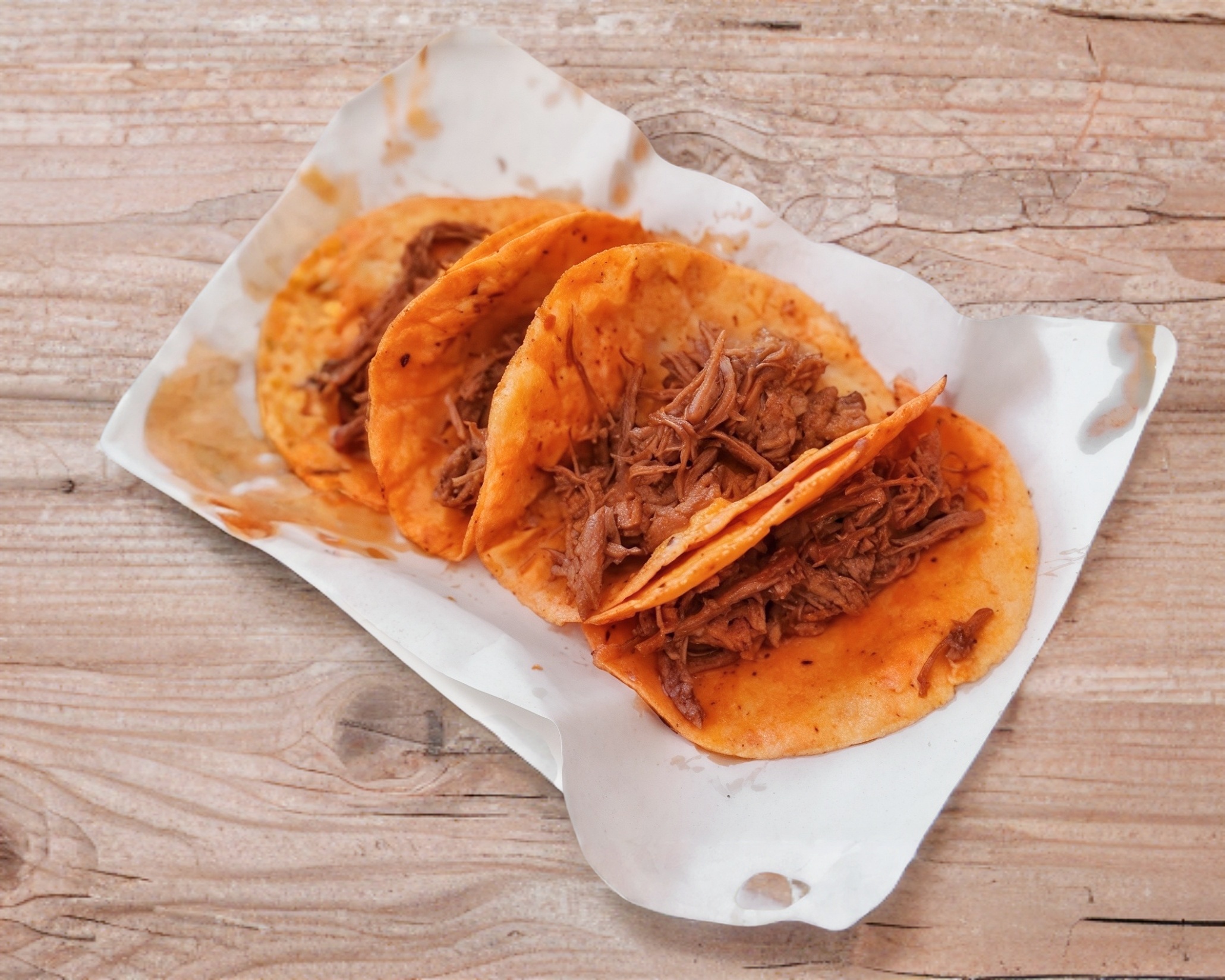 Orden de 3 tacos con doble tortilla de maiz, marinadas y doraditas con birria