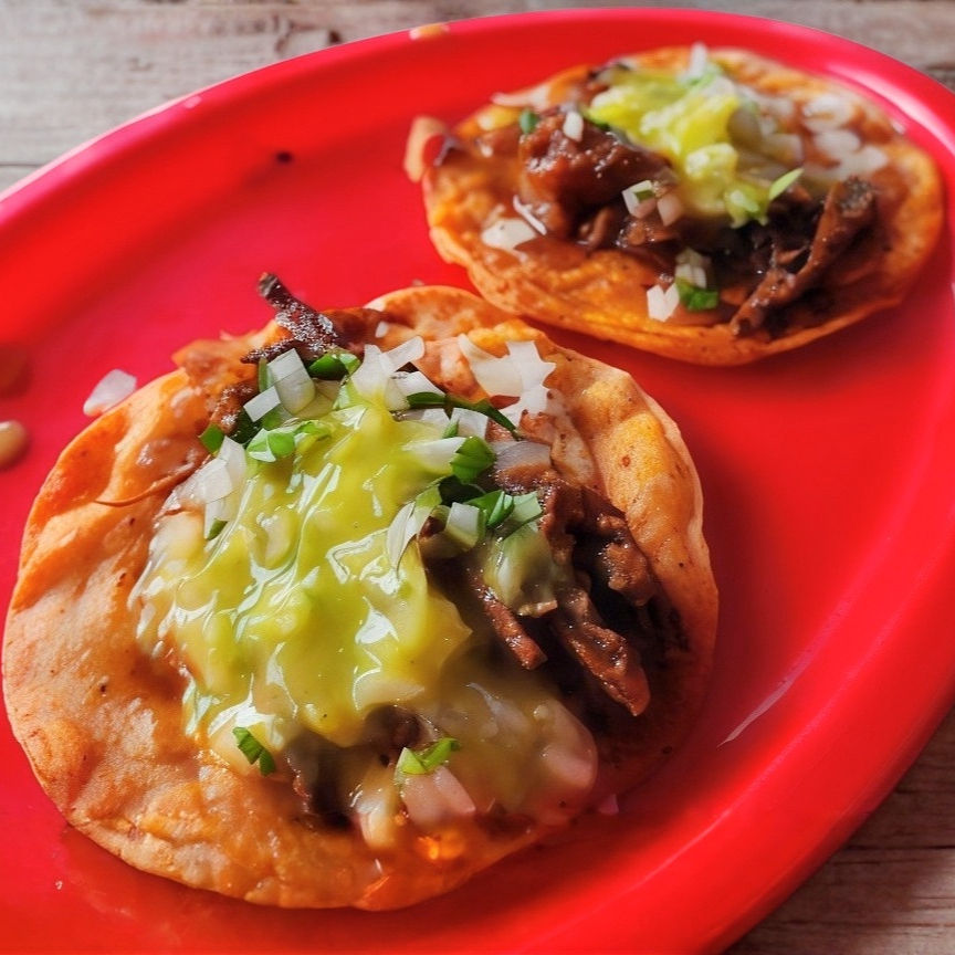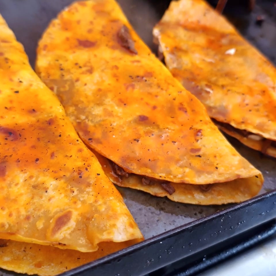 Tortilla de maíz marinada y doradita con deliciosa costra de quesillo y carne de Birria y carne de Birria.