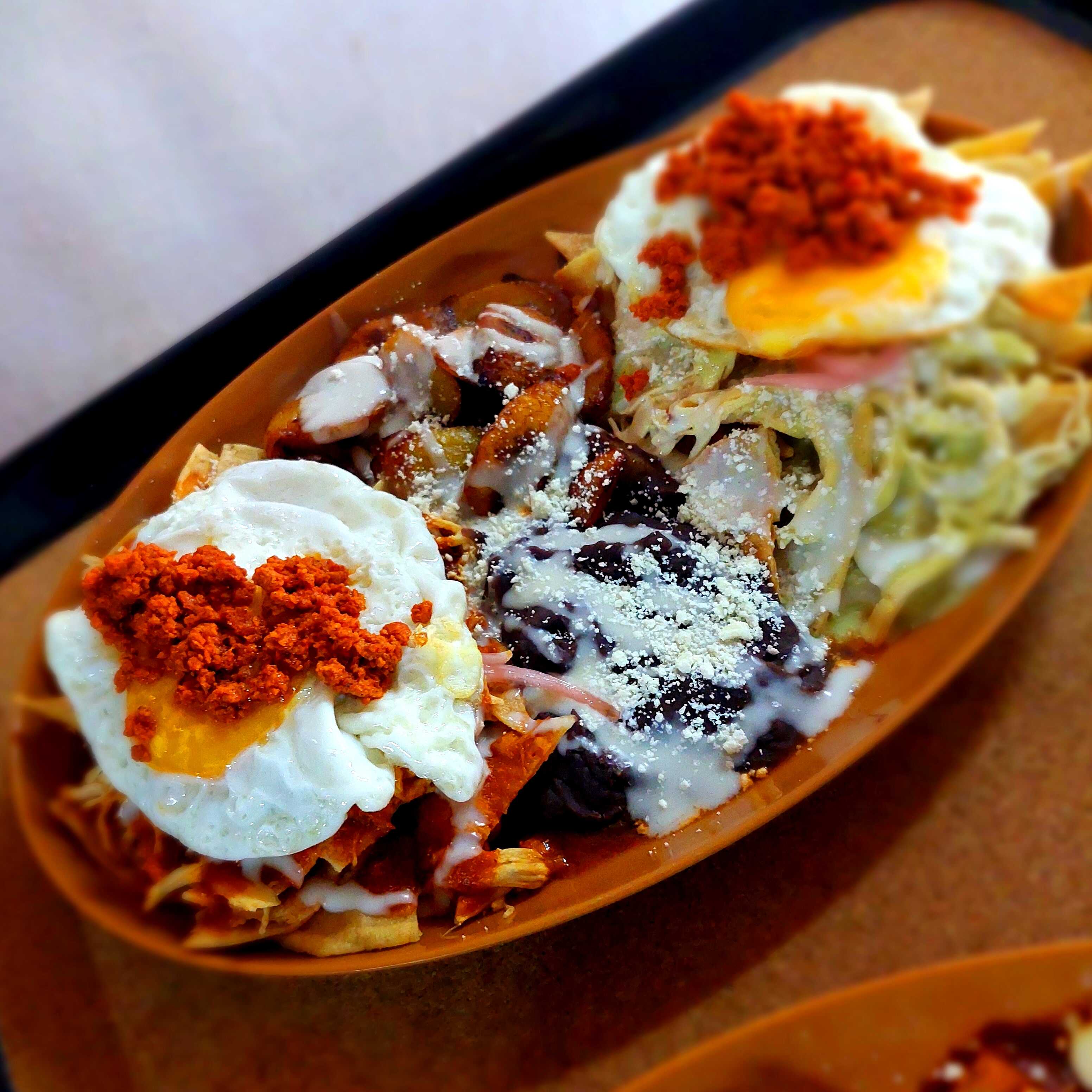 Totopos caseros bañados en salsa roja y verde, servidos con pollo, chorizo ranchero y huevos fritos. Acompañados con crema, queso, cebolla, plátanos y frijoles.