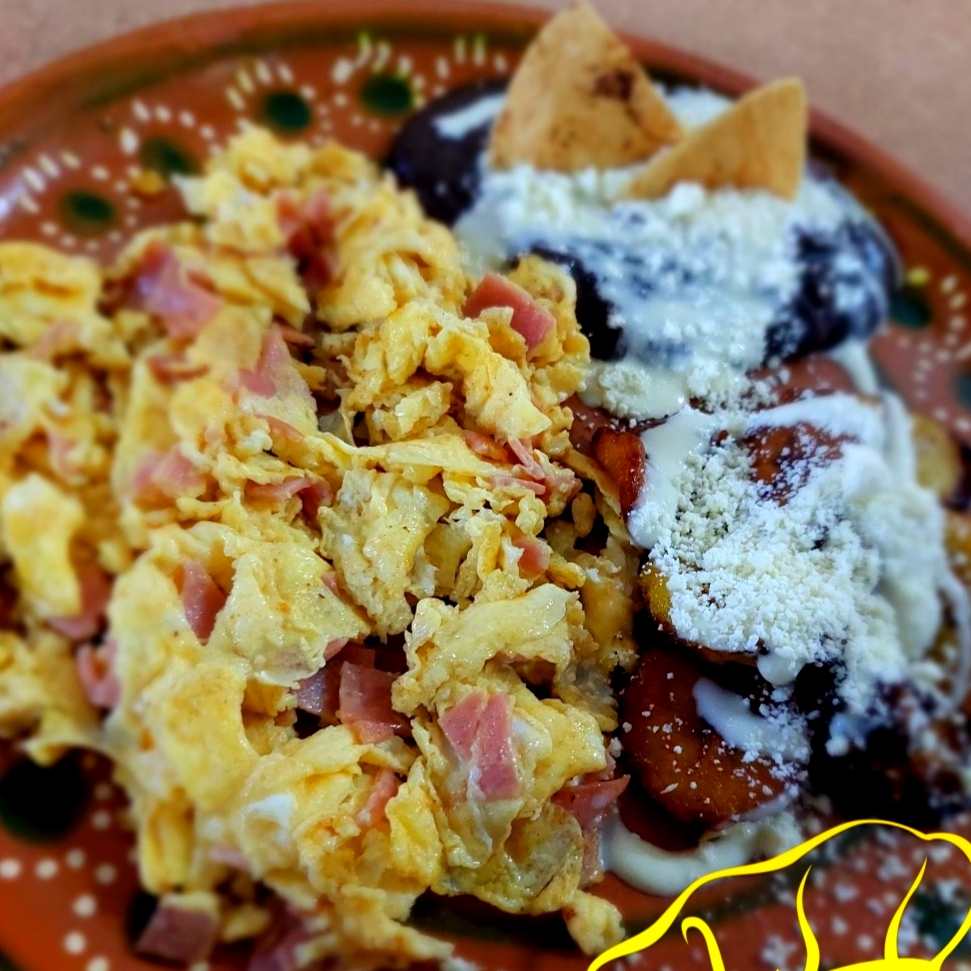 Revueltos con tocino y servidos con plátanos fritos, frijoles refritos, tortilla y salsa picante.