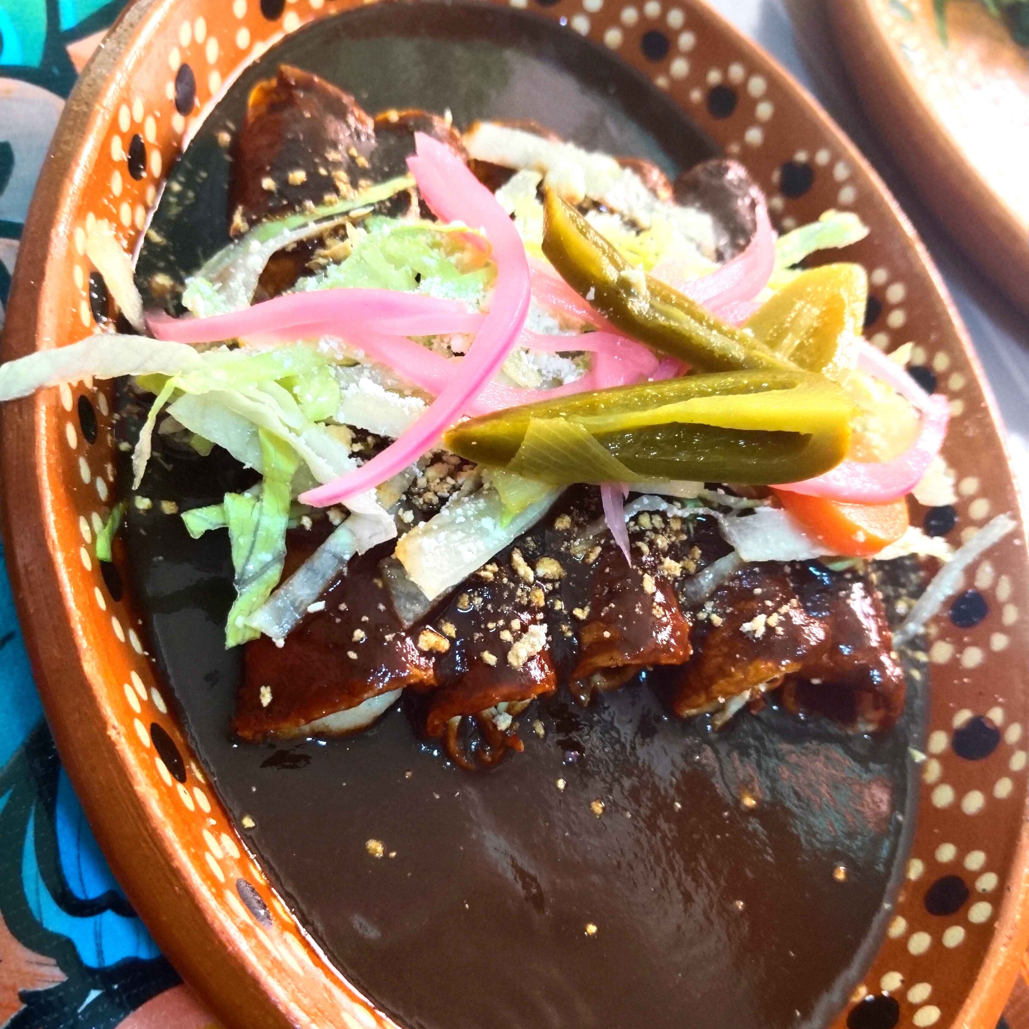 5 pzas De tortillas de maíz, rellenas de pollo y servidas con mole negro, lechuga, queso, cebolla curtida y chiles en raja.