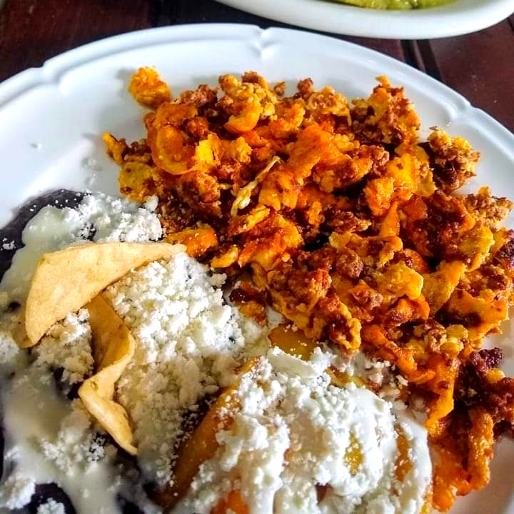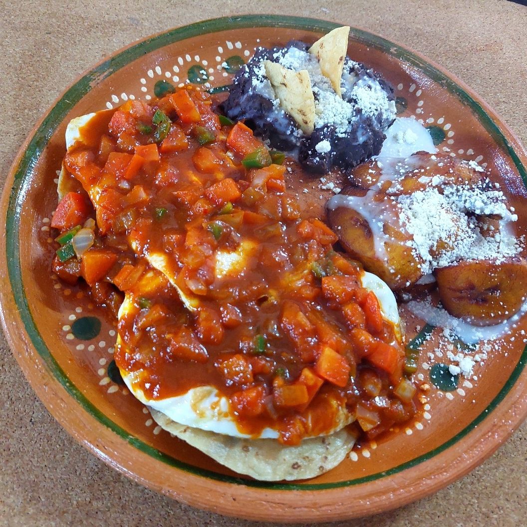 Totopos caseros bañados en salsa roja, servidos con pollo o huevos fritos. acompañados con crema, queso, cebolla, frijoles y plátanos fritos.
