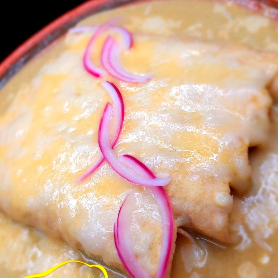 5 pzas De tortilla de harina rellenas de pollo, bañadas en salsa roja, gratinadas con queso manchego y servidas con cebolla curtida.