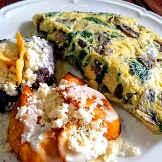 Tortilla de huevo con espinacas y champiñones, rellena de queso manchego y servido con plátanos fritos, frijoles, tortillas y salsa picante.