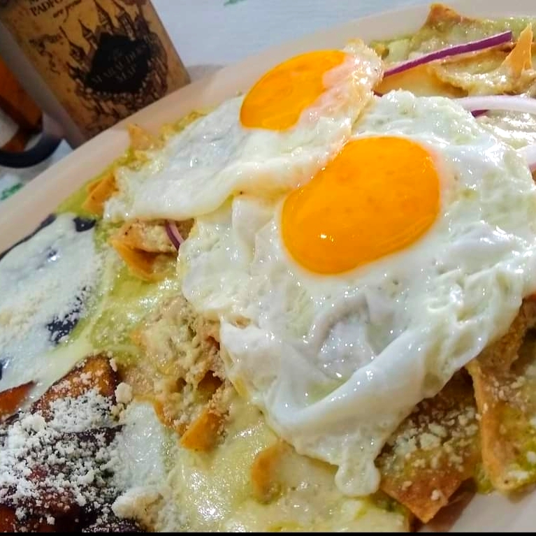 Totopos caseros bañados en salsa verde y gratinados con queso manchego, servidos con pollo o huevos fritos y acompañados con crema, queso, cebolla, frijoles y plátanos fritos.