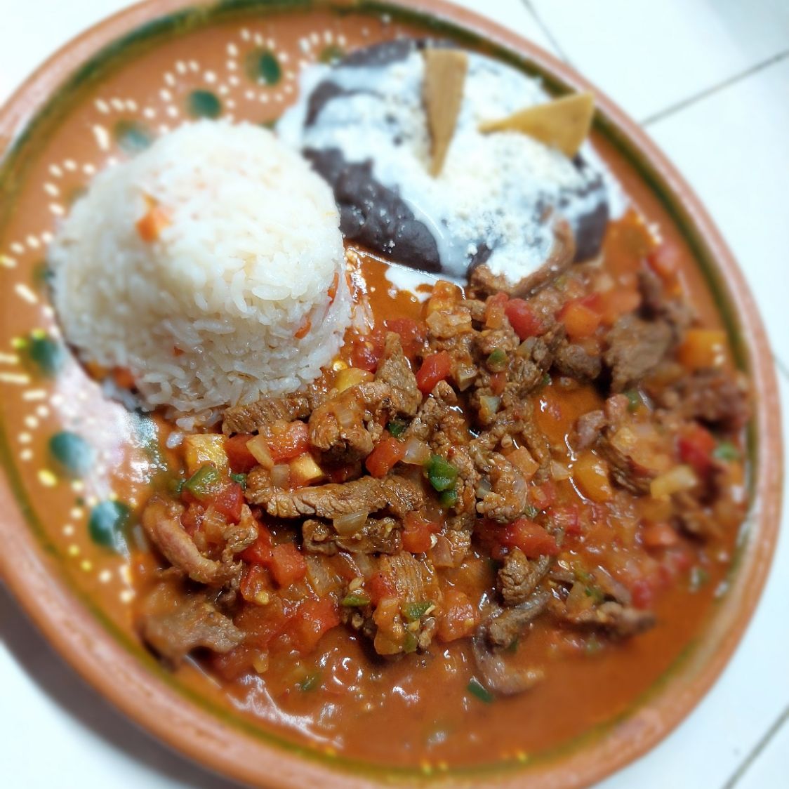 Fajitas de res con tomate, cebolla y chile jalapeño. Acompañado de frijoles refritos, arroz, tortillas y salsa picante.