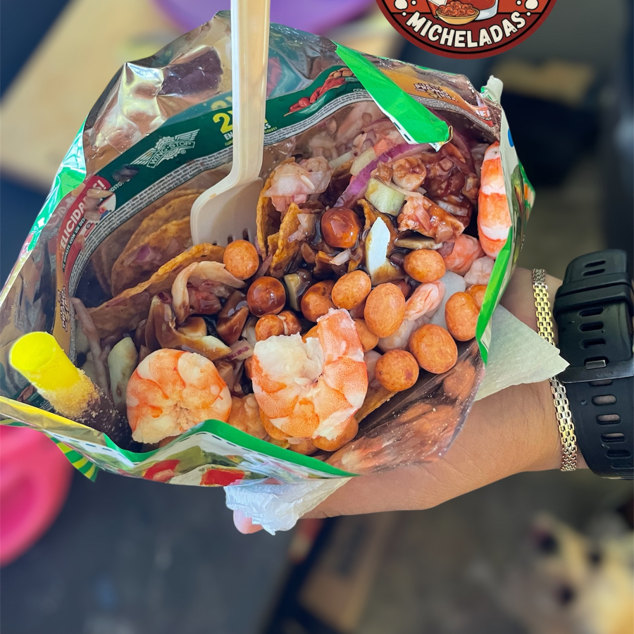 Tostitos con camarón , pepino, cebolla, cacahuates , sal, limón, clamato y salsas de la casa
