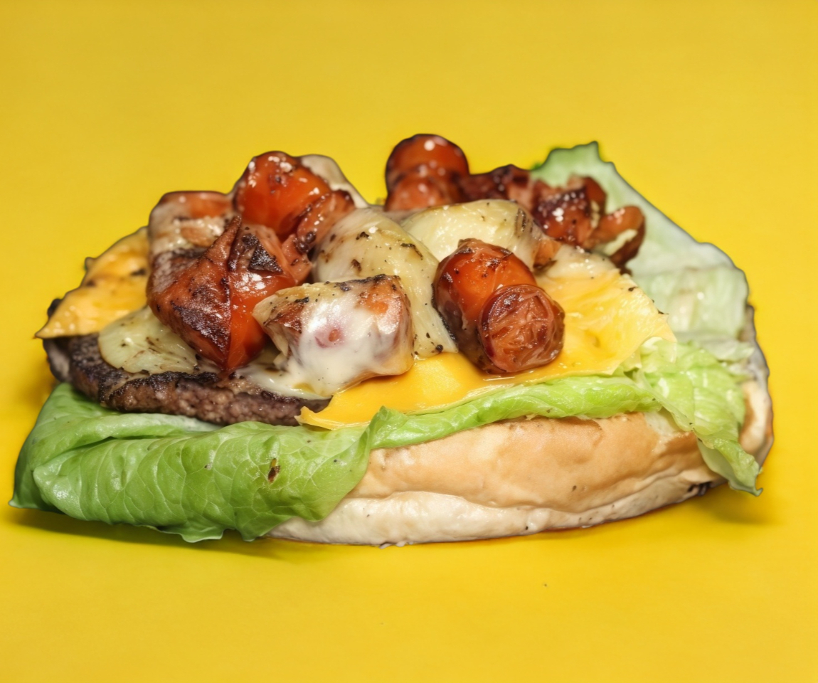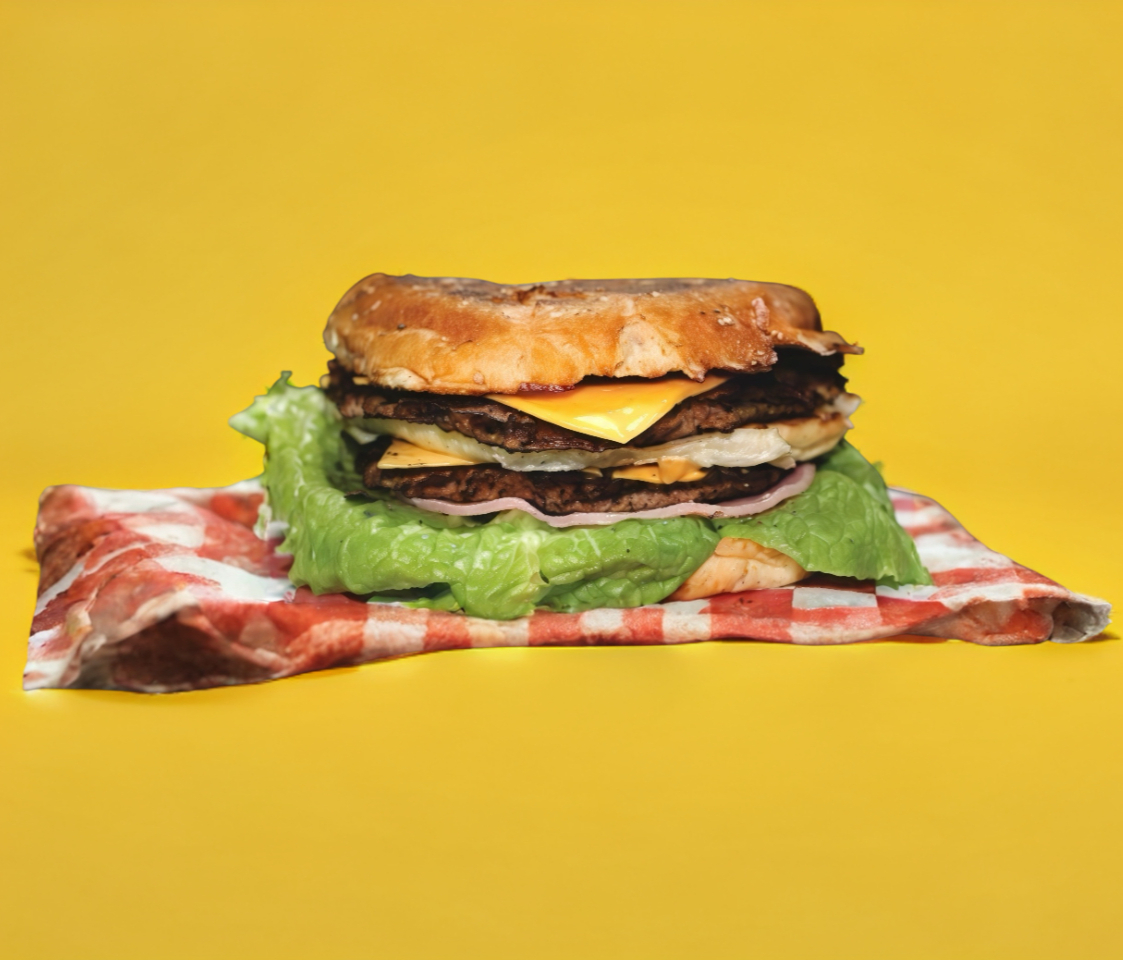 Doble carne, queso amarillo, tomate, cebolla y lechuga.